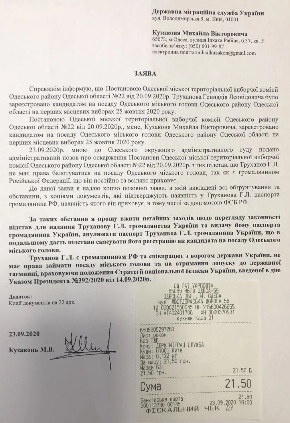 Труханов неодноразово брехав публічно, що в нього немає російського громадянства, але паспорти кожного разу замінював особисто, що передбачено російським законодавством. Тож у реєстрації Труханов вказав недостовірні відомості , бо громадянам України не дозволяється наявність іншого громадянства, – пояснив Михайло Кузаконь.