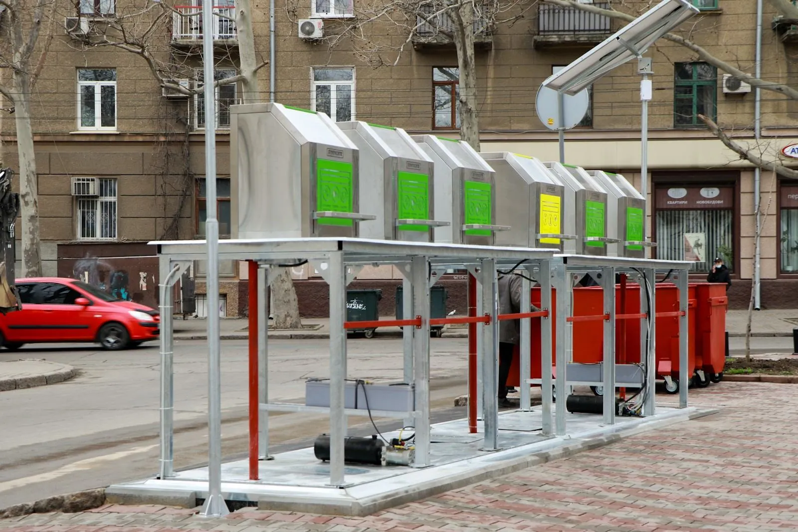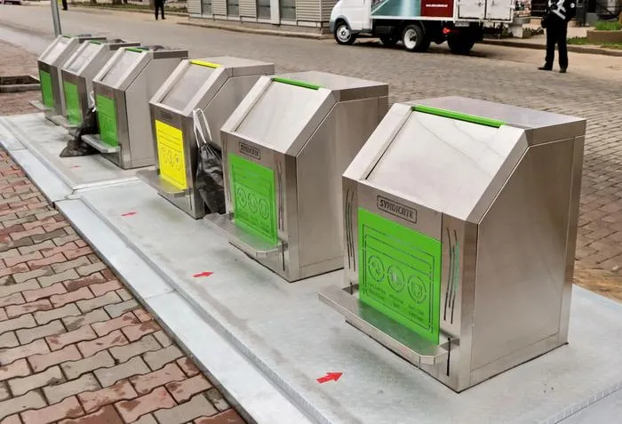 Баки-приймачі, розміщені над землею, обладнані Led-підсвічуванням. На них помістили наклейки з інформацією про види відходів.