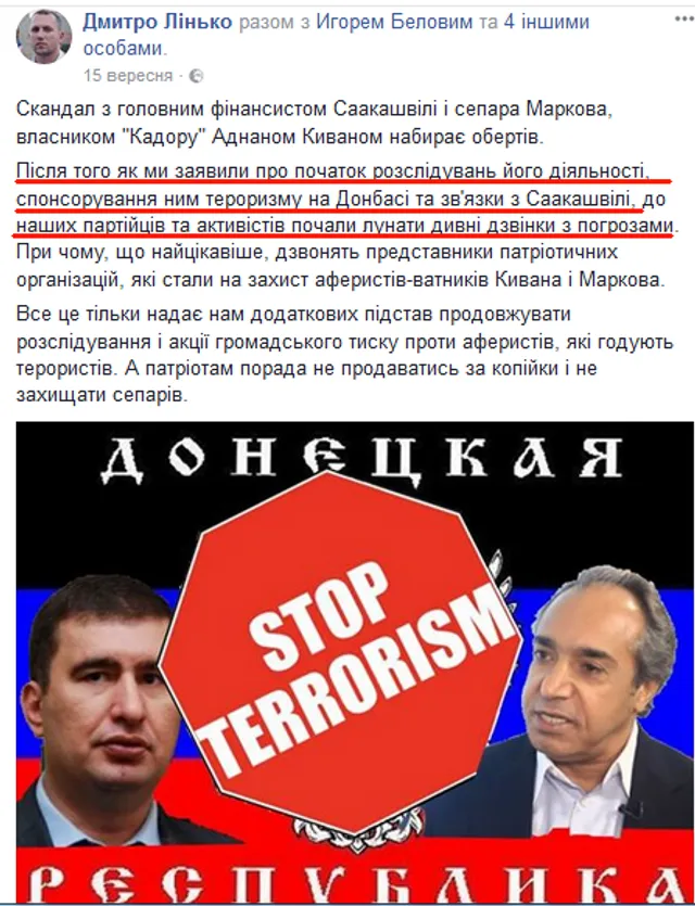 Після публічних виступів про можливе фінансування Аднана Ківана бойовиків на сході України на адресу членів Радикальної партії почали надходити погрози, про що вони повідомляли в соцмережах.
