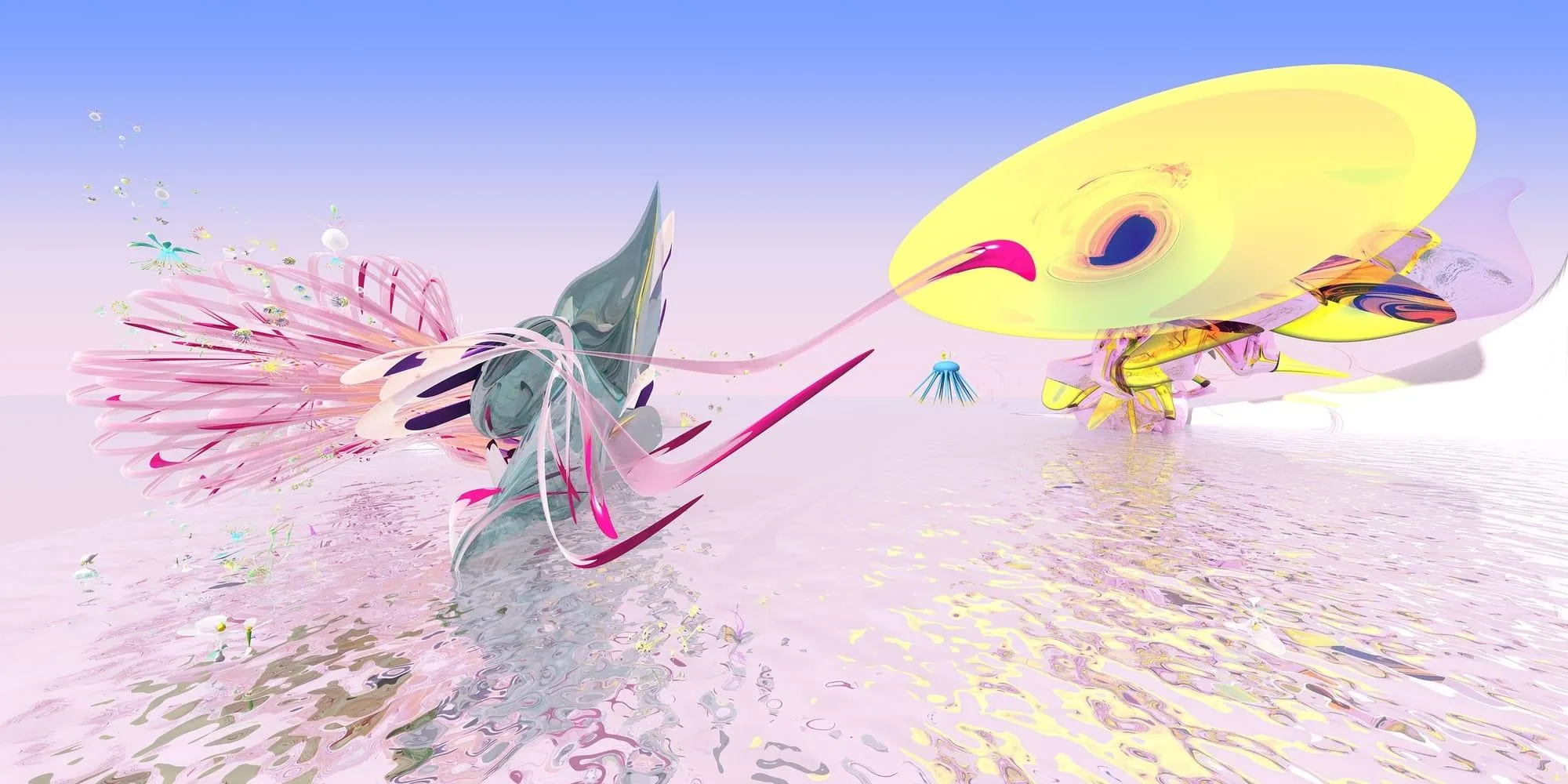 Зауважимо, що нерухомі та анімовані твори Рябченка зображують позаземні пейзажі. На них – уявні рослини та тварини, часто натхненні комп'ютерними вірусами.