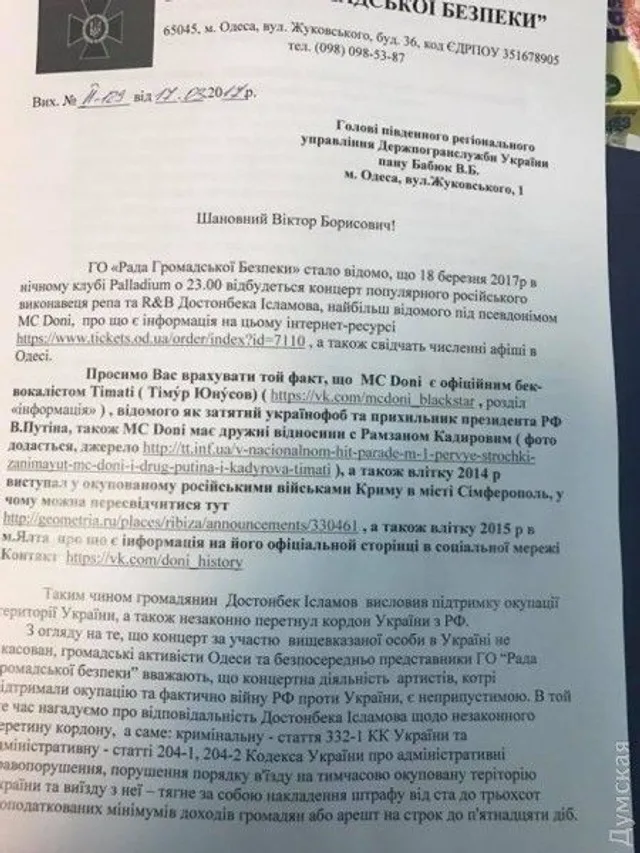 Активісти направили до СБУ відповідного листа з інформацією щодо концертної діяльності бек-вокаліста Тіматі. Тож якщо Служба безпеки оперативно відреагує на інформацію – співак просто не зможе перетнути кордон.