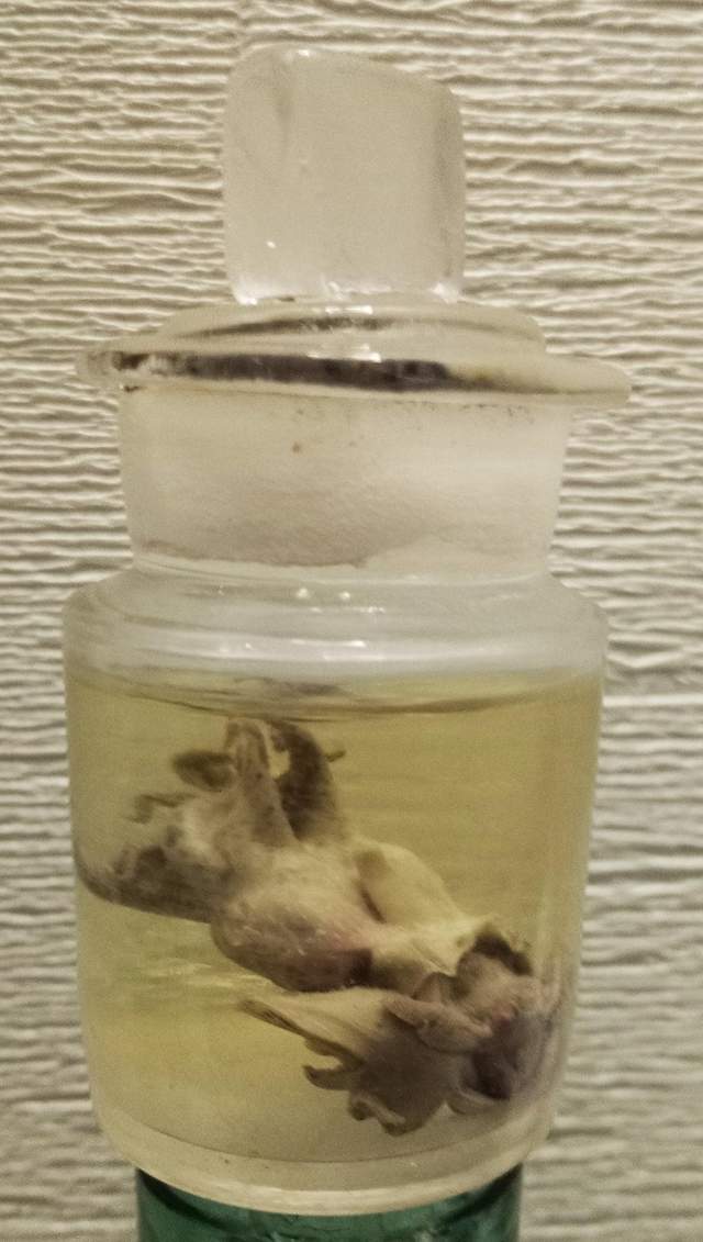Банку з восьминогом знайшли серед десятків інших медичних флаконів. Їх датування – приблизно 1930 – 1940 роки. Маленький восьминіг був залитий формаліном. Тому, ймовірно, його мали використовувати, як лікувальний засіб.