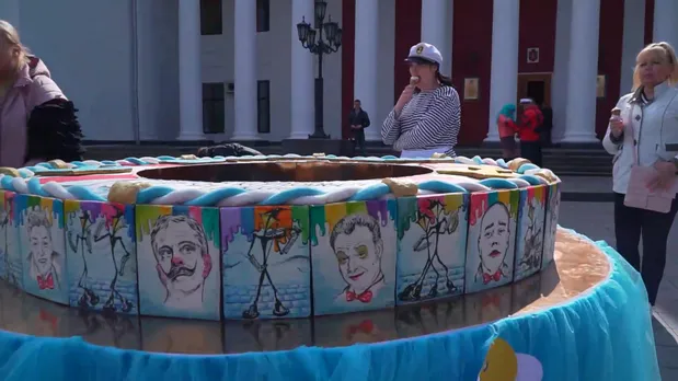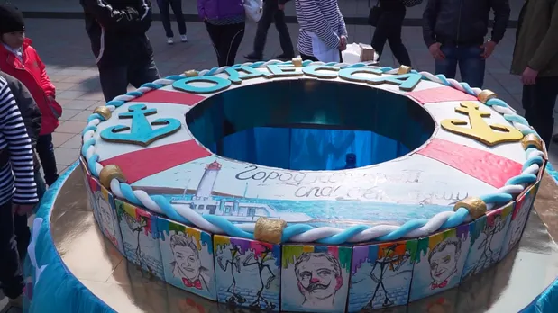 Спеціально для свята сміху кондитери презентували солодке "рятувальне коло". Двометровий шоколадно-пряниковий торт вагою понад півтори сотні кілограмів. На ньому зображений одеський маяк, поруч напис "Місто для душі".