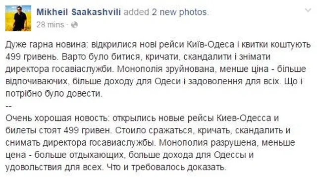 "Монополія зруйнована. Менша ціна – більше відпочиваючих, більше доходу для Одеси і задоволення для всіх", – написав Саакашвілі.