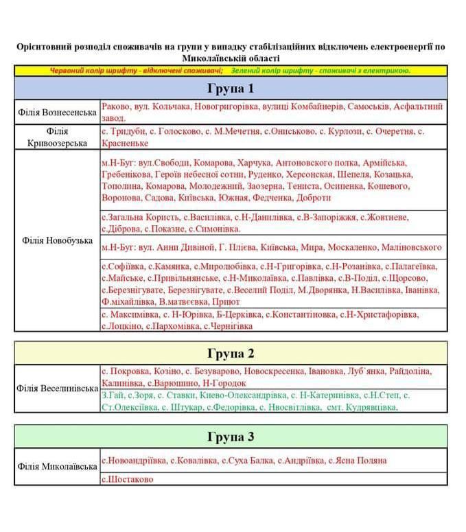 Графік відключень світла у Миколаївській області / Джерело Миколаївобленерго