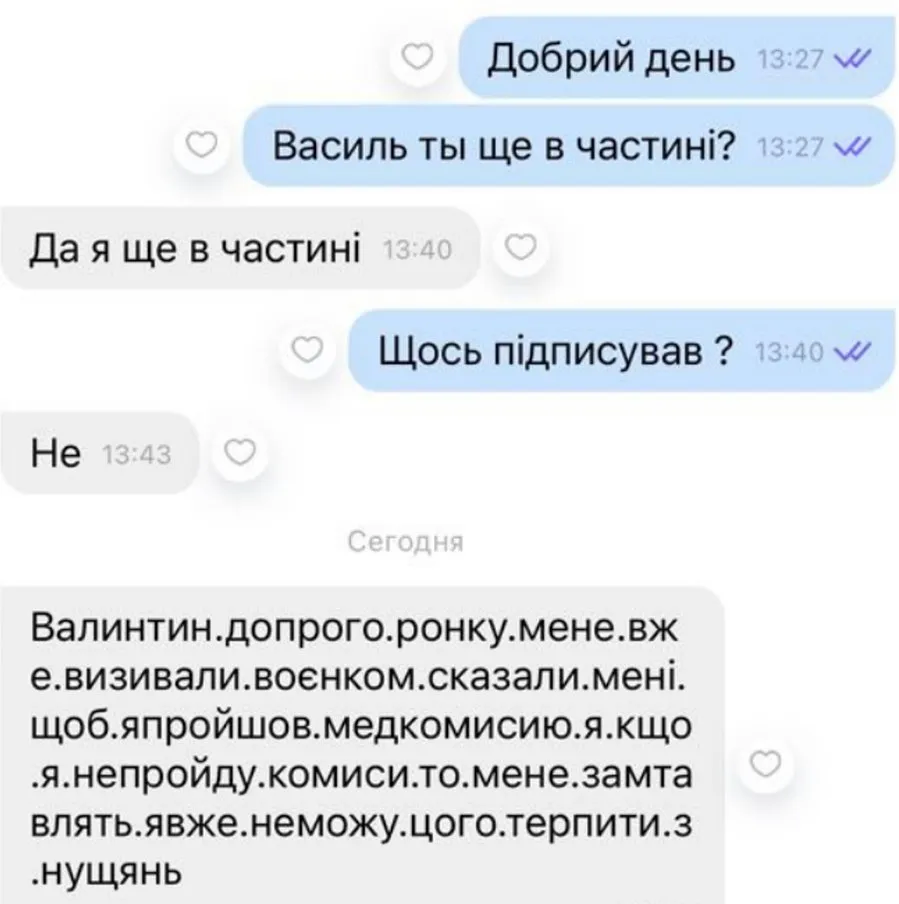 "Здійснюються погрози, що якщо він самостійно не пройде ВЛК, то його змусять пройти. Вже видали їм форму, ночами підіймають по тривозі, змушують відтискатися, бігати, тобто вчиняються відносно нього тортури, катування", – розповів він.