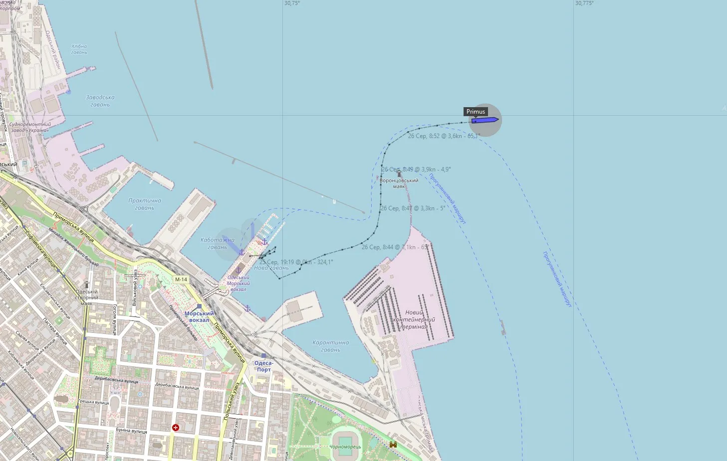 Про це повідомив керівник проєкту "Інституту Чорноморських Стратегічних досліджень" Андрій Клименко. Балкер PRIMUS став другим судном, яке вийшло з порту Одеси після зупинки "зернової угоди".