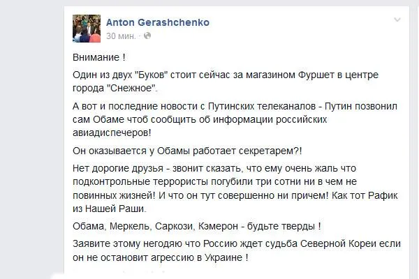 "Один з двох "Буків" стоїть зараз за магазином "Фуршет" у центрі міста "Сніжне"", - написав Геращенко.