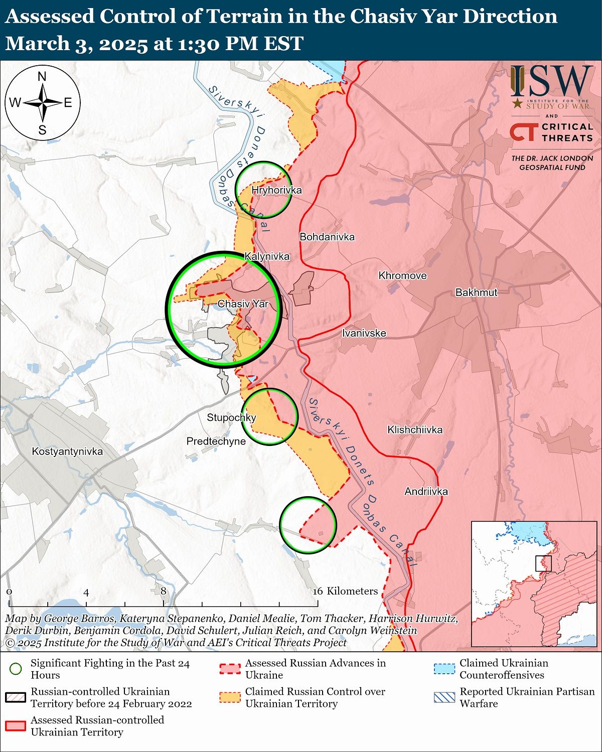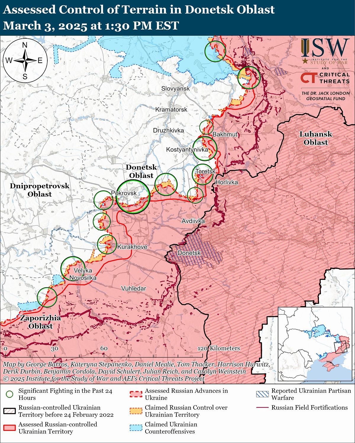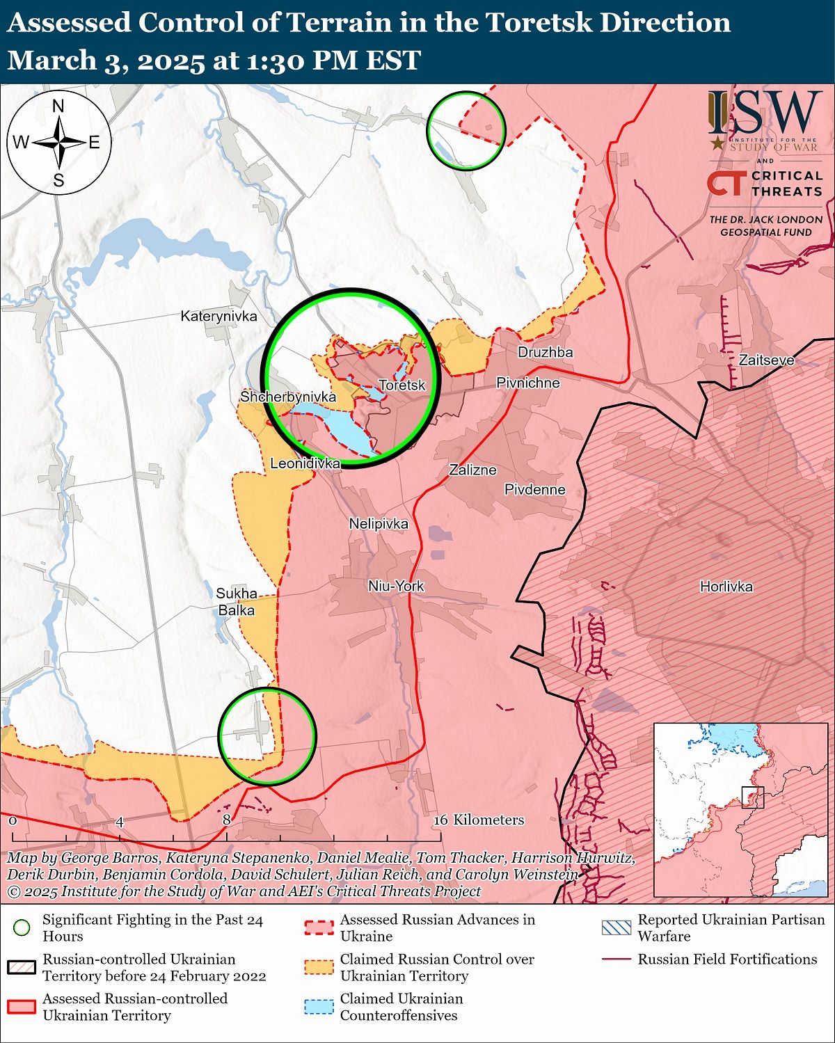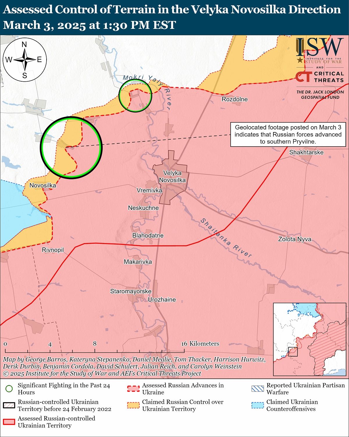 Російські війська не мали успіху на Курахівському напрямку. Однак окупанти нещодавно просунулися вперед поблизу Великої Новосілки. Геолокаційні кадри, опубліковані 3 березня, вказують на те, що російські війська нещодавно просунулися в південно-східному Привільному.