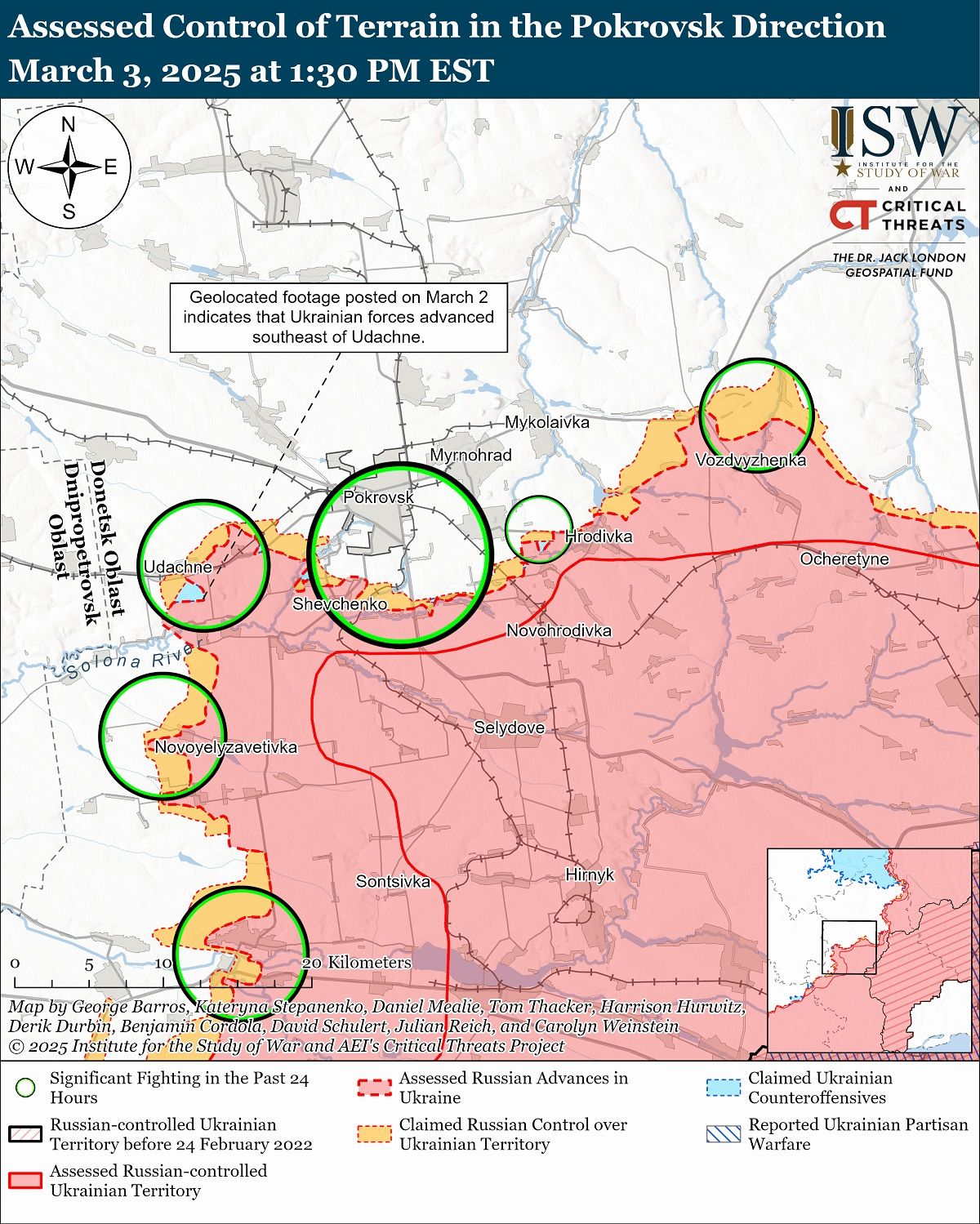 Нещодавно українські війська просунулися вперед на Покровському напрямку. Геолокаційні кадри, опубліковані 2 березня, вказують на те, що українські сили нещодавно просунулися вперед у полях на південний схід від Удачного (на південний захід від Покровська).