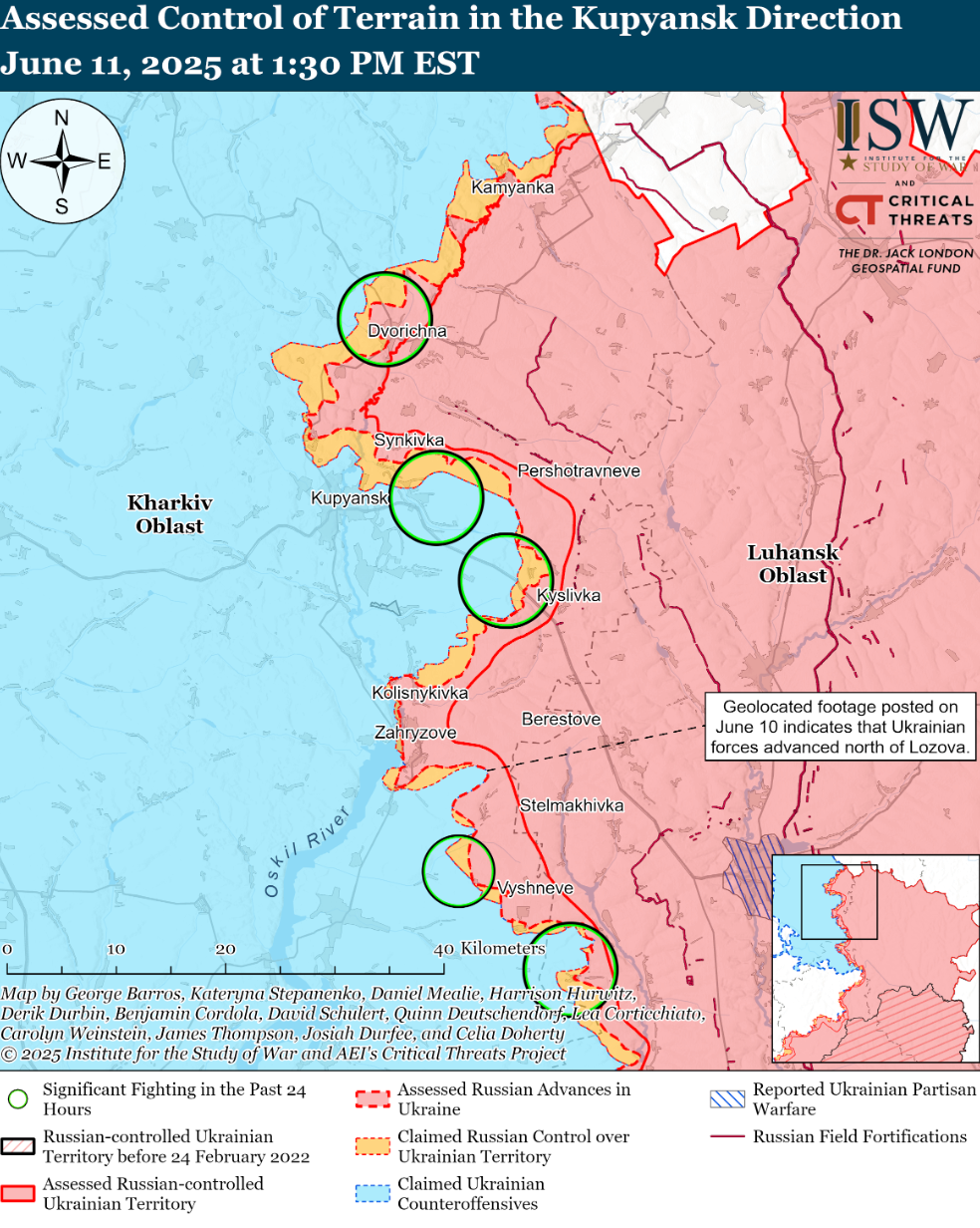 - Сили оборони України нещодавно просунулися на Борівському напрямку. Геолокаційні відеозаписи, опубліковані 10 червня, свідчать про те, що українські війська відбили позиції на північ від Лозової (на північний схід від Борової), що свідчить про те, що армія ворога не здійснює повного контролю над районом поблизу Лозової.