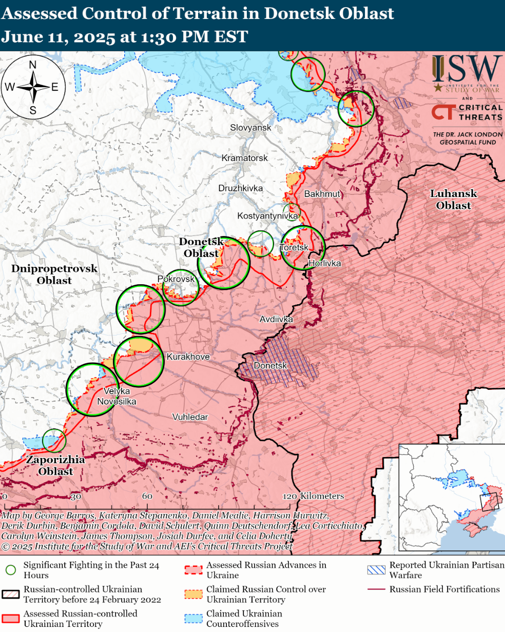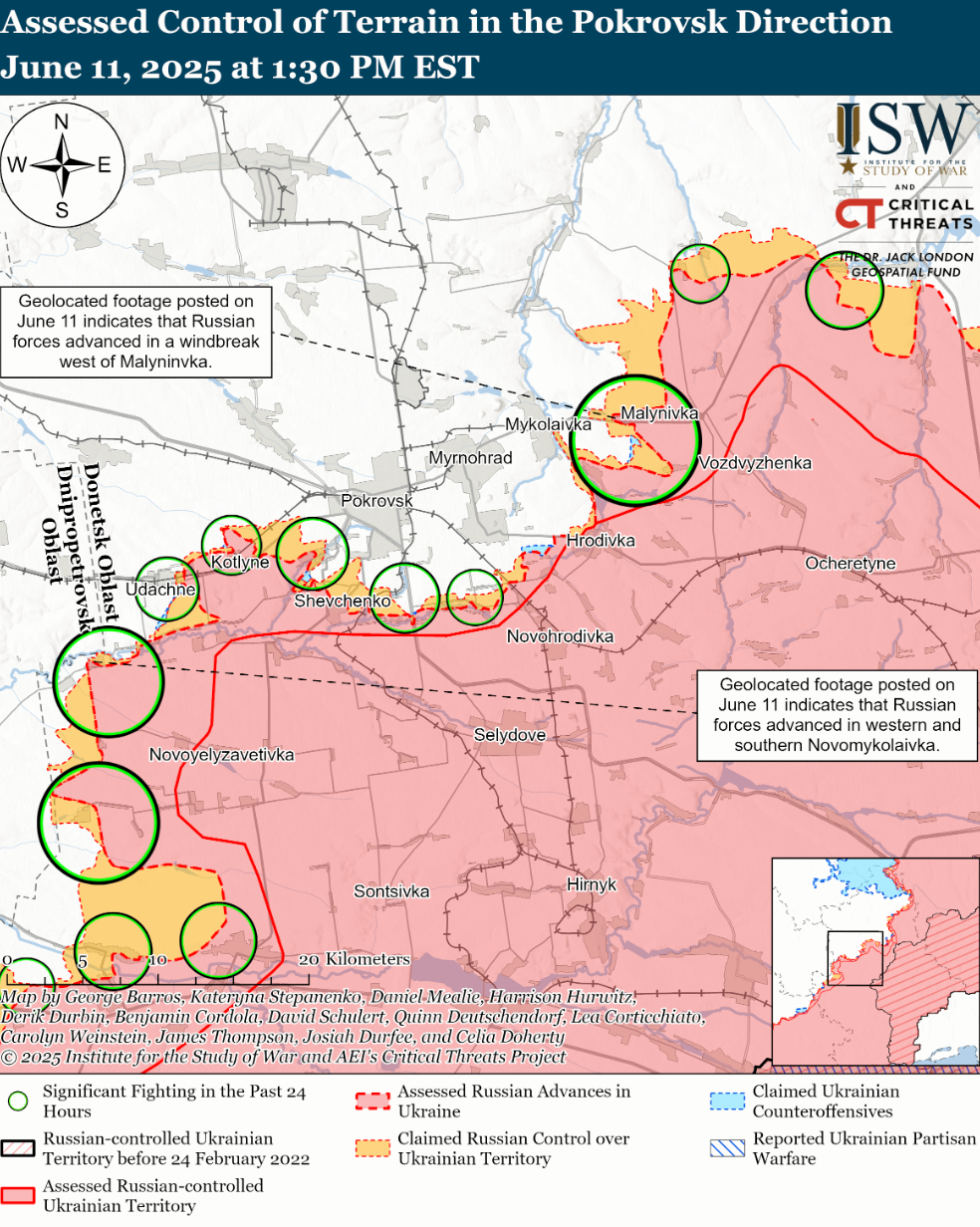 - Противник також просунувся на Покровському напрямку. Геолокаційні відеозаписи, опубліковані 11 червня, свідчать про те, що російські війська нещодавно просунулися на захід від Малинівки (на схід від Покровська).
