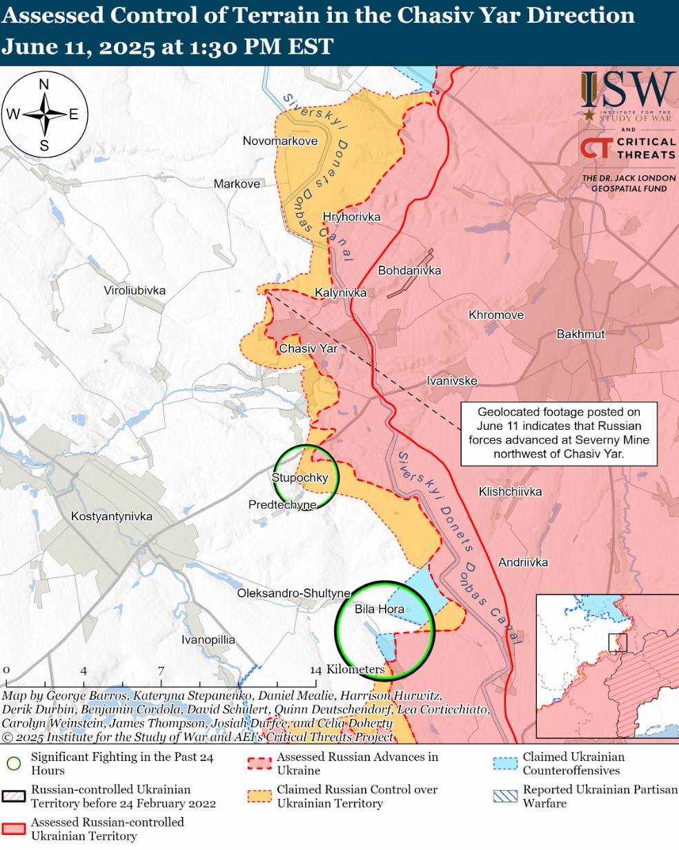- Ворожі сили нещодавно просунулися в напрямку Часового Яру. Геолокаційні записи, опубліковані 11 червня, свідчать про те, що російські війська нещодавно просунулися в районі шахти "Північний" на північ від Часового Яру.