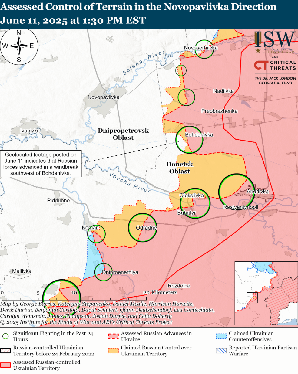 - Ворог також нещодавно просунувся на Новопавлівському напрямку. Геолокаційні відеозаписи, опубліковані 11 червня, свідчать про те, що росіяни нещодавно просунулися на південний захід від Новомиколаївки (на північний схід від Новопавлівки) та на захід і південний захід від Богданівки (на південний схід від Новопавлівки).