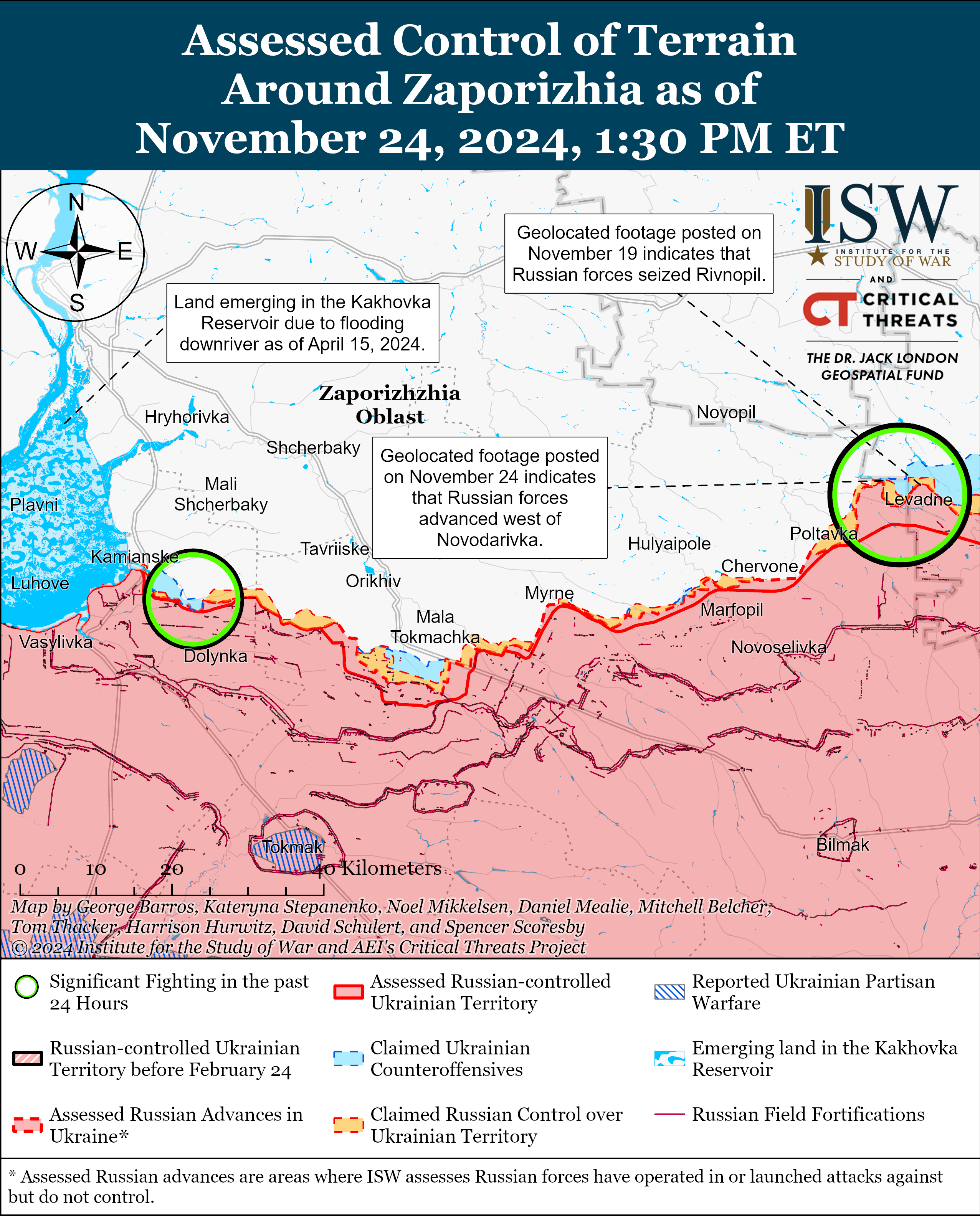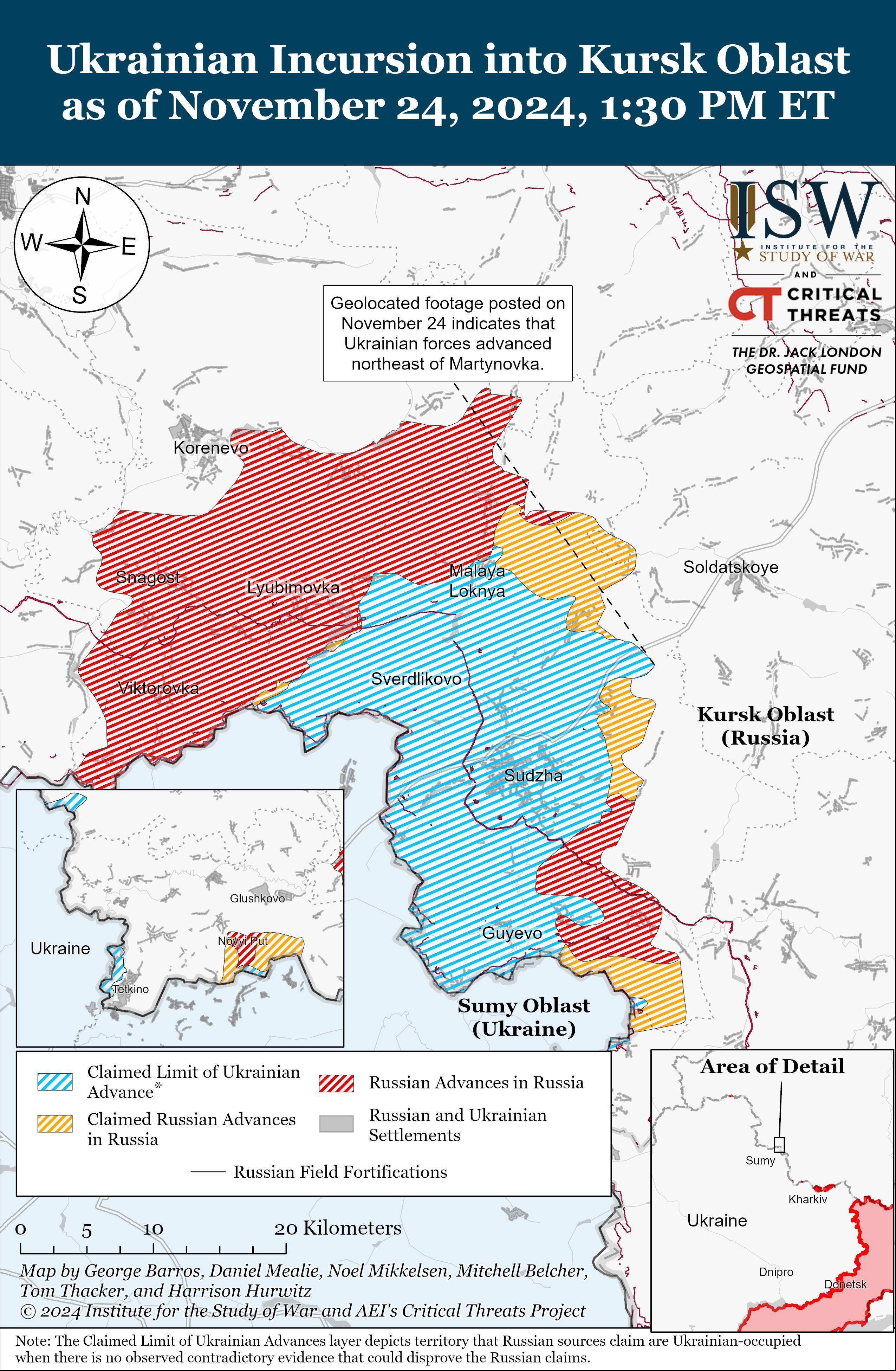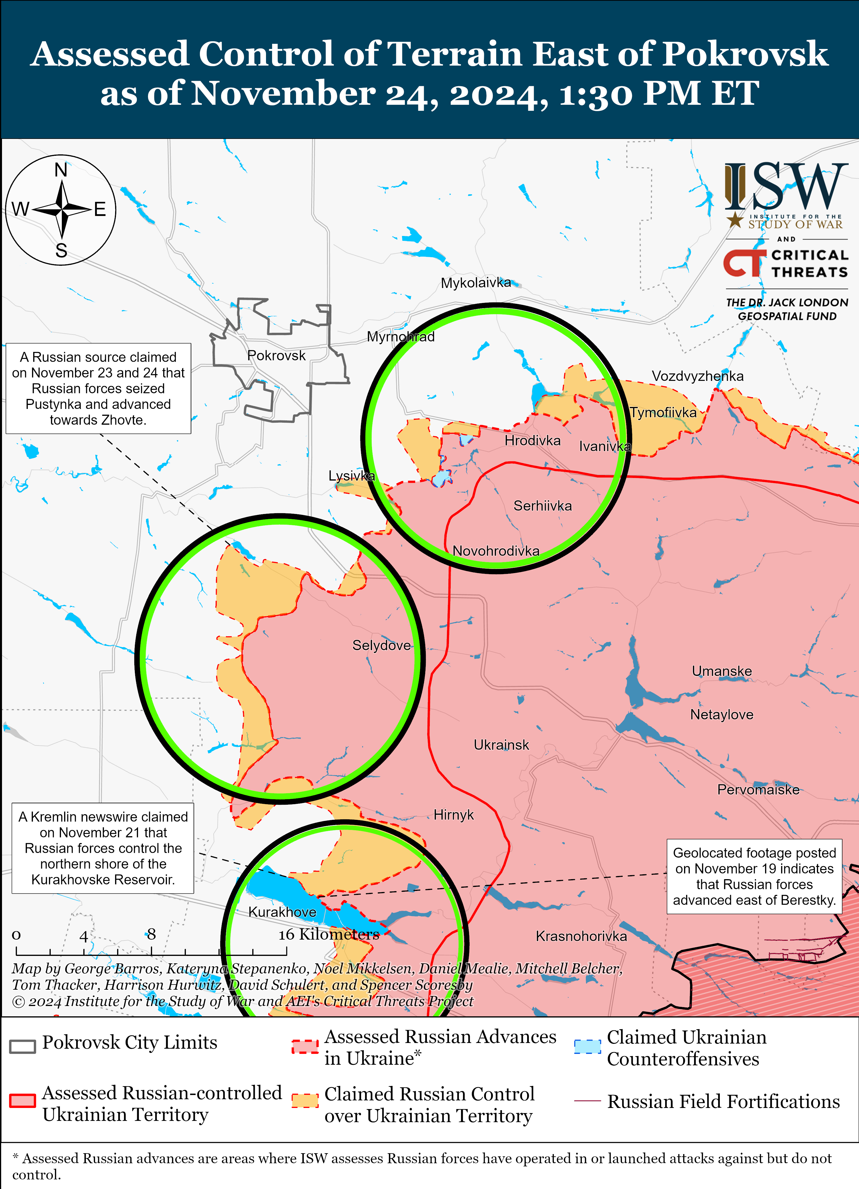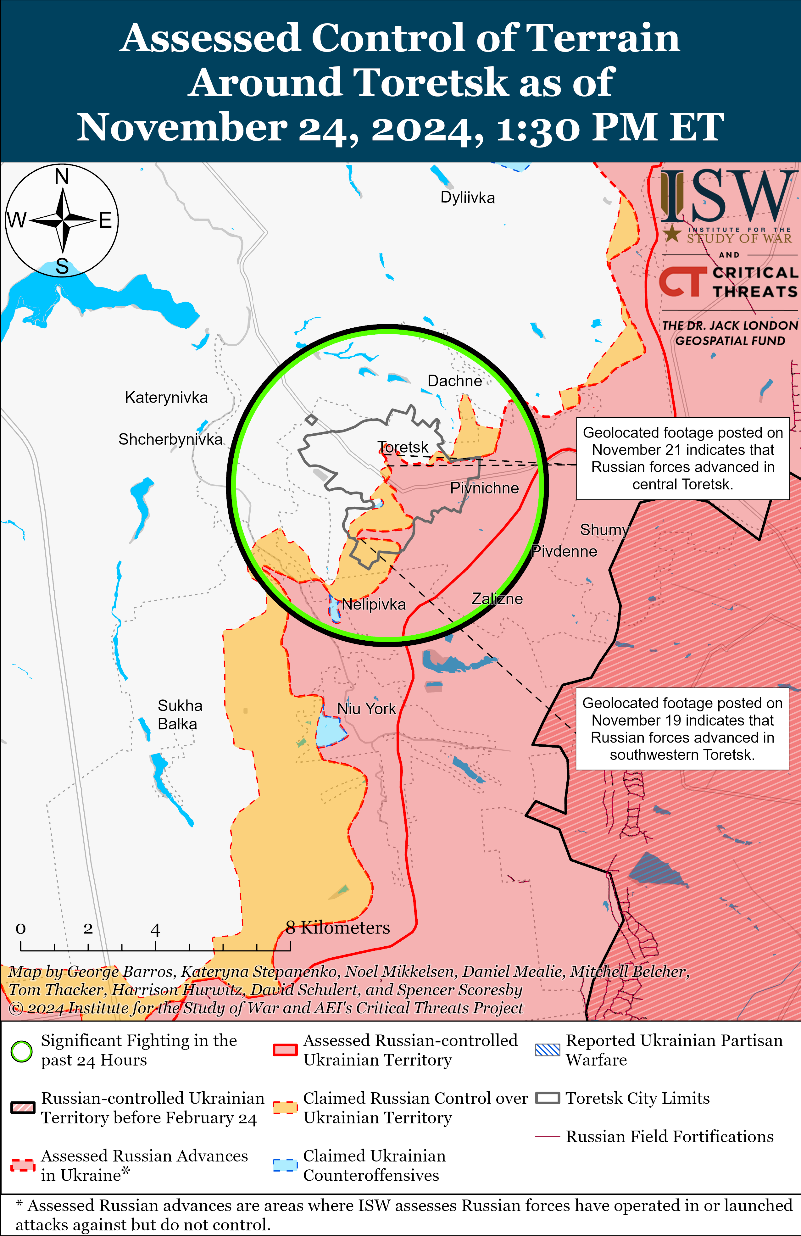 - 24 листопада російські війська вели наступальні дії під Торецьком, проте підтверджених змін лінії фронту не було. Але російські війська просунулися на Покровському напрямку. Геолокаційні кадри від 22 листопада свідчать, що вони просунулися на південь від Лисівки. На Курахівському напрямку підтвердженого просування не було.