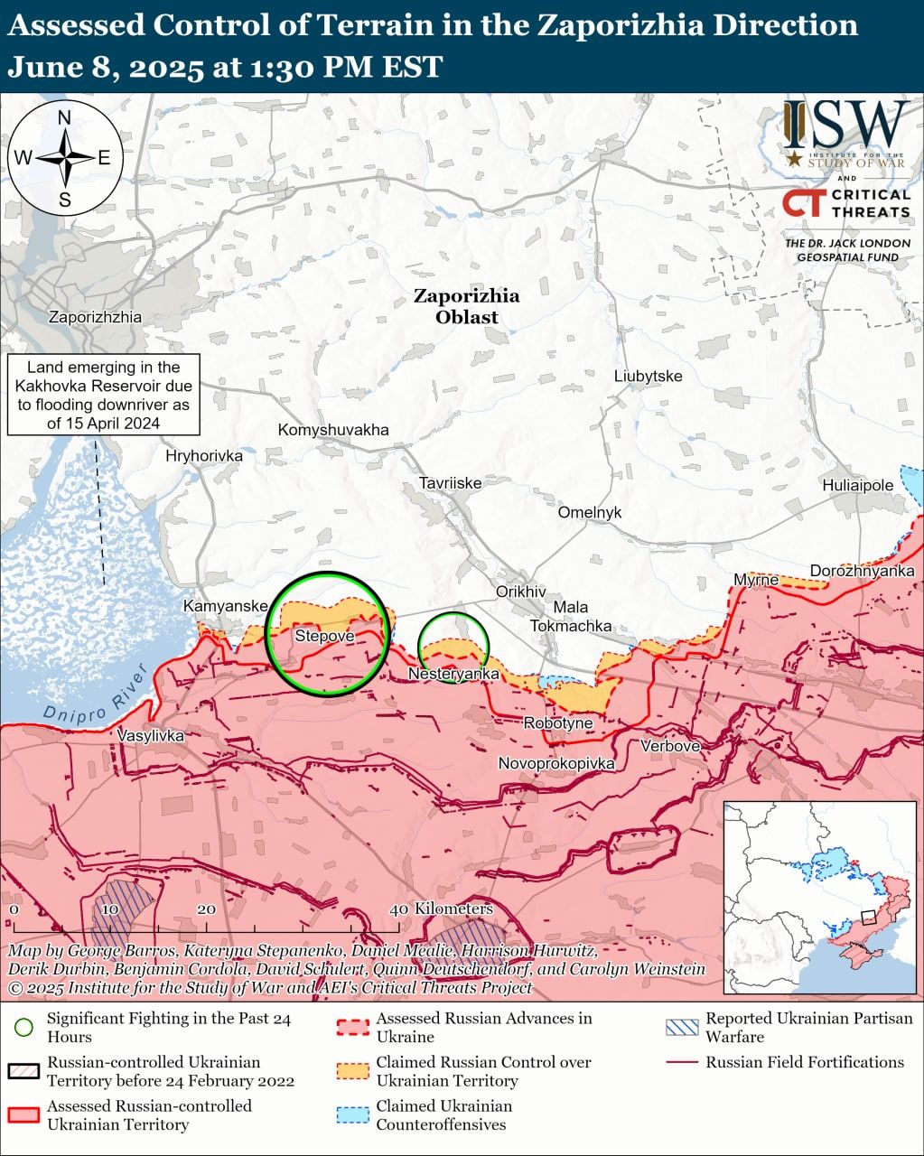 Аналітики описали ситуацію на фронті за добу 8 червня. За даними Інституту в неділю в Кремлі та міністерство оборони Росії заявили, що окупанти дійшли до кордону Донецької та Дніпропетровської області, де проводяться наступальні операції. Однак представник Генштабу Збройних Сил України Андрій Ковальов заявив, що це неправда, а росіяни знову поширили дезінформацію.
