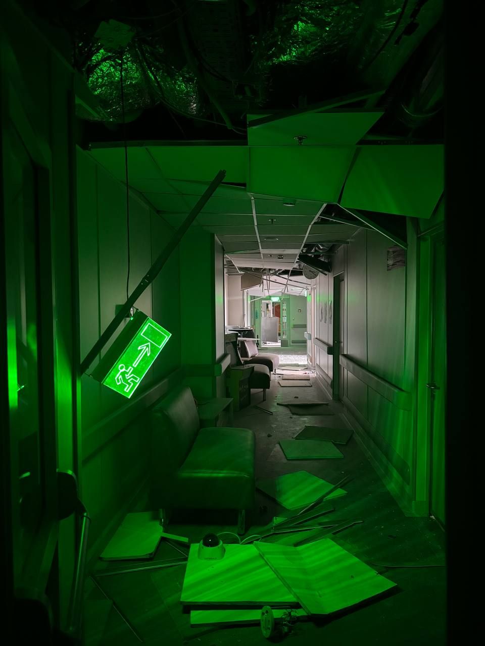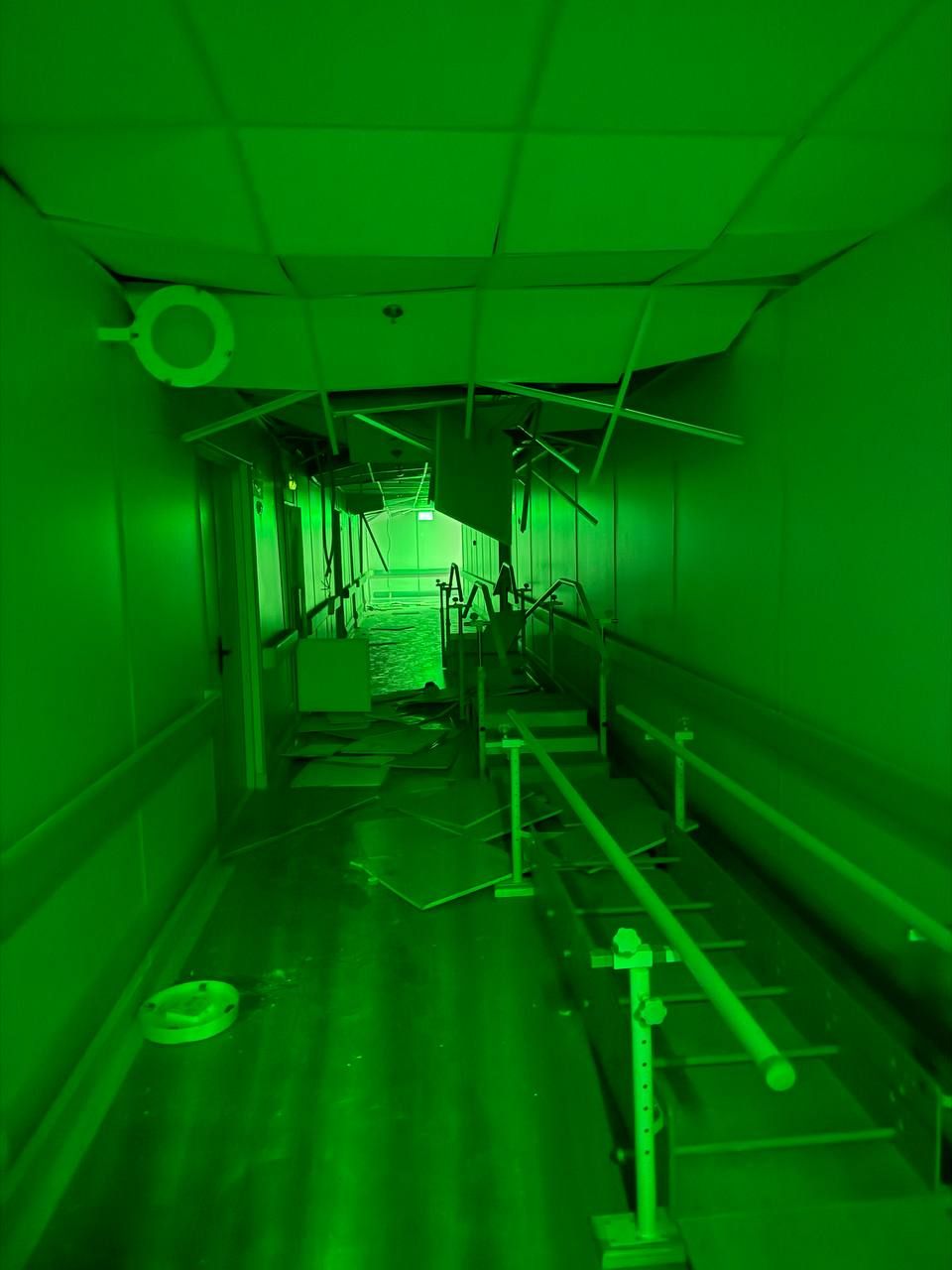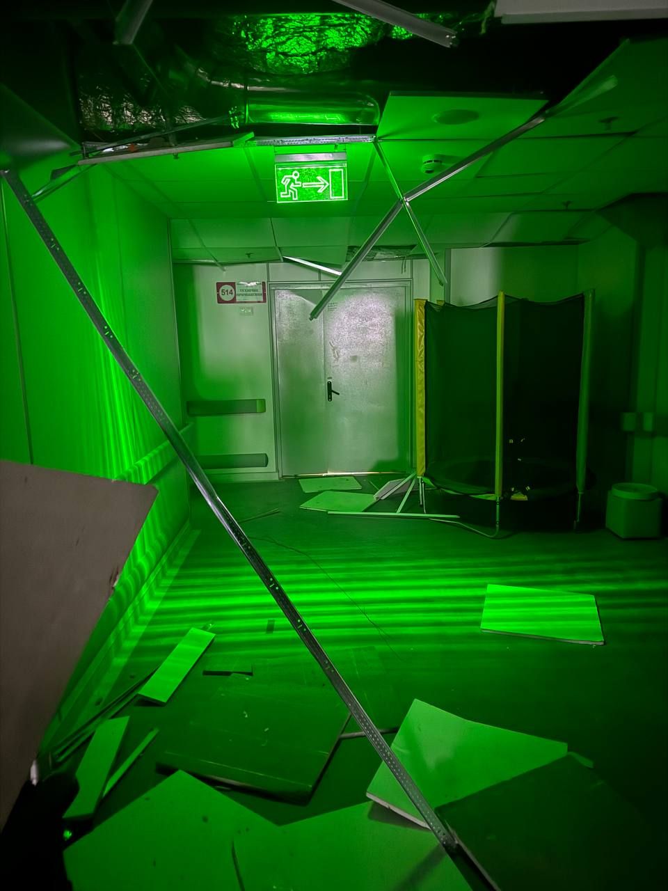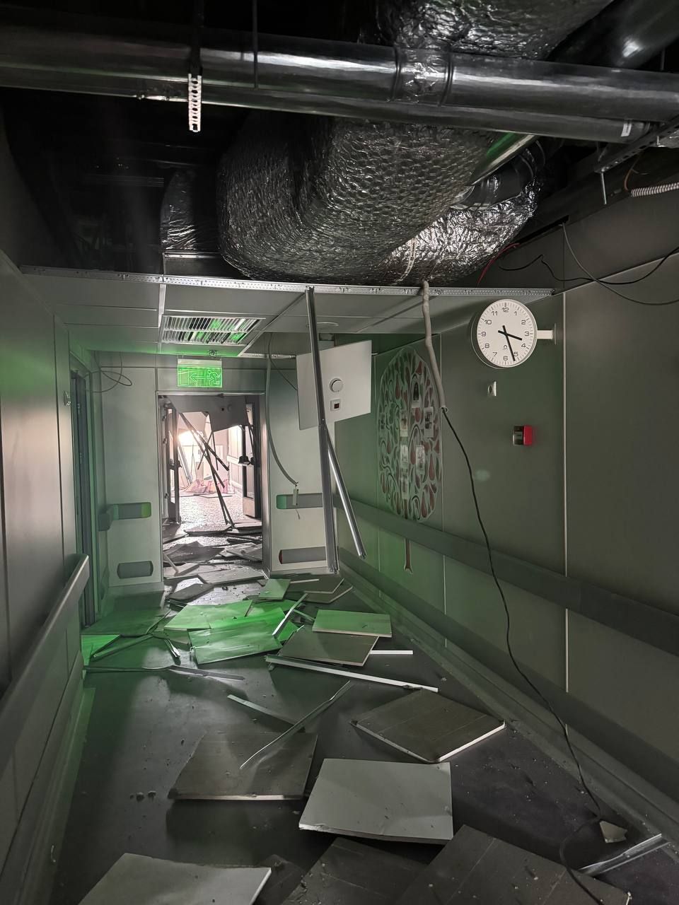 На оприлюднених світлинах видно, що сильно постраждала стеля у різних приміщеннях медзакладу. Її частини або лежать на підлозі, або ж ледве звисають з кріплень. Зокрема, внаслідок удару вибито вікна. Так, повсюди помітно уламки скла на підлозі.