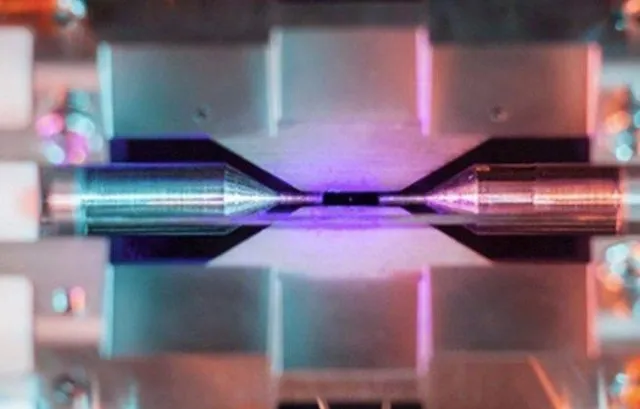 Атом на фотографії утримуваний полями, що виходять від обвідних металевих електродів. Відстань між маленькими наконечниками голок становить близько 2 міліметрів.