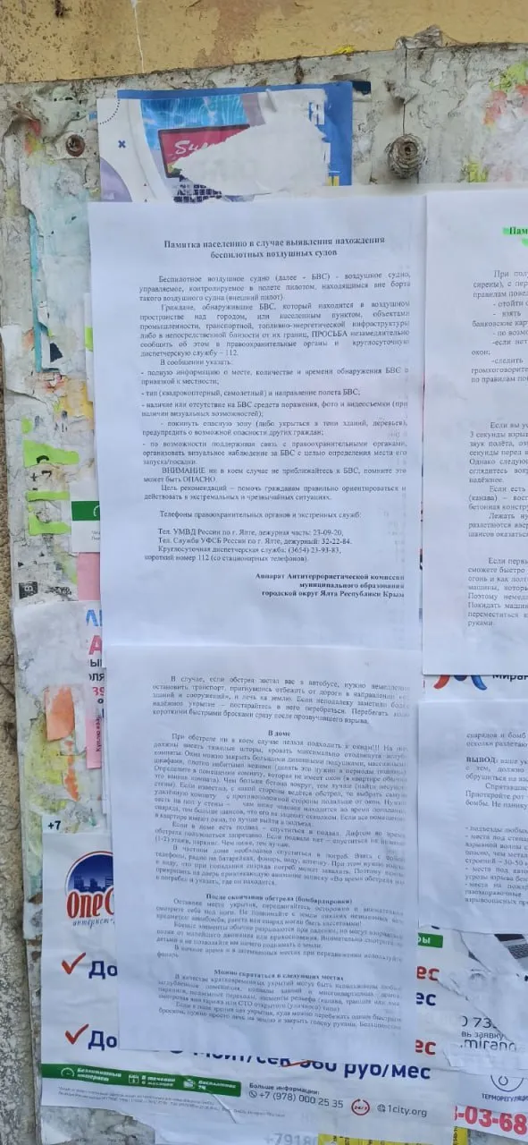 У Ялті на дошках оголошень розклеїли пам'ятки на випадок виявлення безпілотників та бомбардування. Про це пише "радіо Свобода".