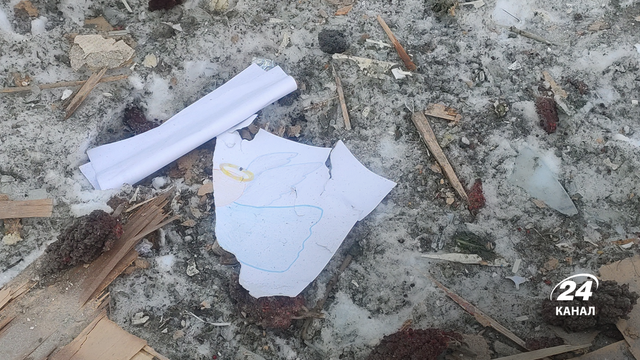 На місці, де раніше була школа, можна побачити зошити школярів, альбоми для малювання, дитячі малюнки, географічні карти, парти тощо. Зауважимо, поруч немає жодних військових об'єктів.