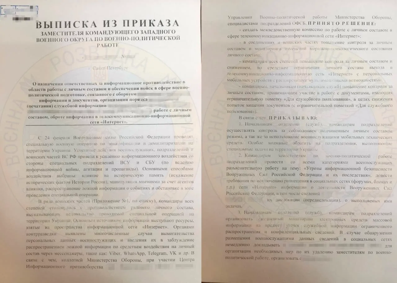 У розпорядженні української розвідки опинилася "Виписка з наказу заступника командувача західного воєнного округу з воєнно-політичної роботи". Російське командування розіслало її у військові частини.