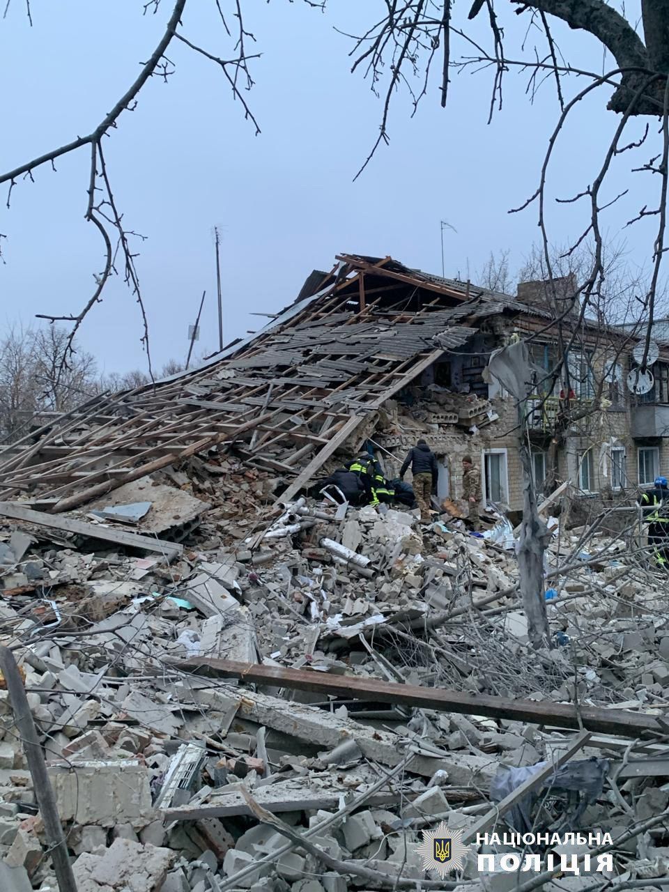 Ворожі снаряди поцілили у двоповерховий житловий будинок та ще один поряд із ним. У двоповерховому будинку з 16 квартир 8 зруйновані. Пошкоджень зазнали також два поліцейські автомобілі.