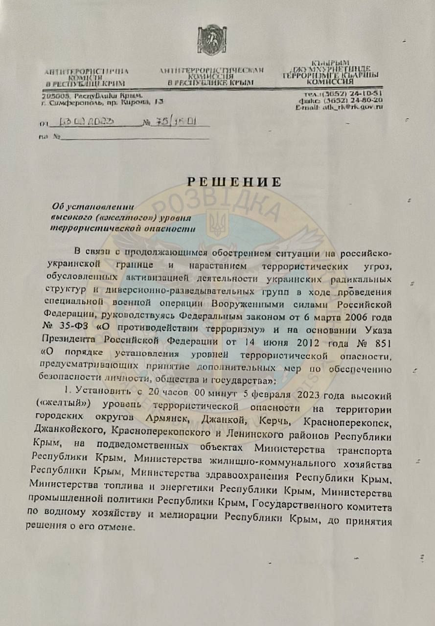 За даними розвідки, російська окупаційна адміністрація Криму та місцеве відділення ФСБ видали "рішення про встановлення високого (жовтого) рівня терористичної небезпеки". Згідно з ним ворог встановив високий рівень загрози в: