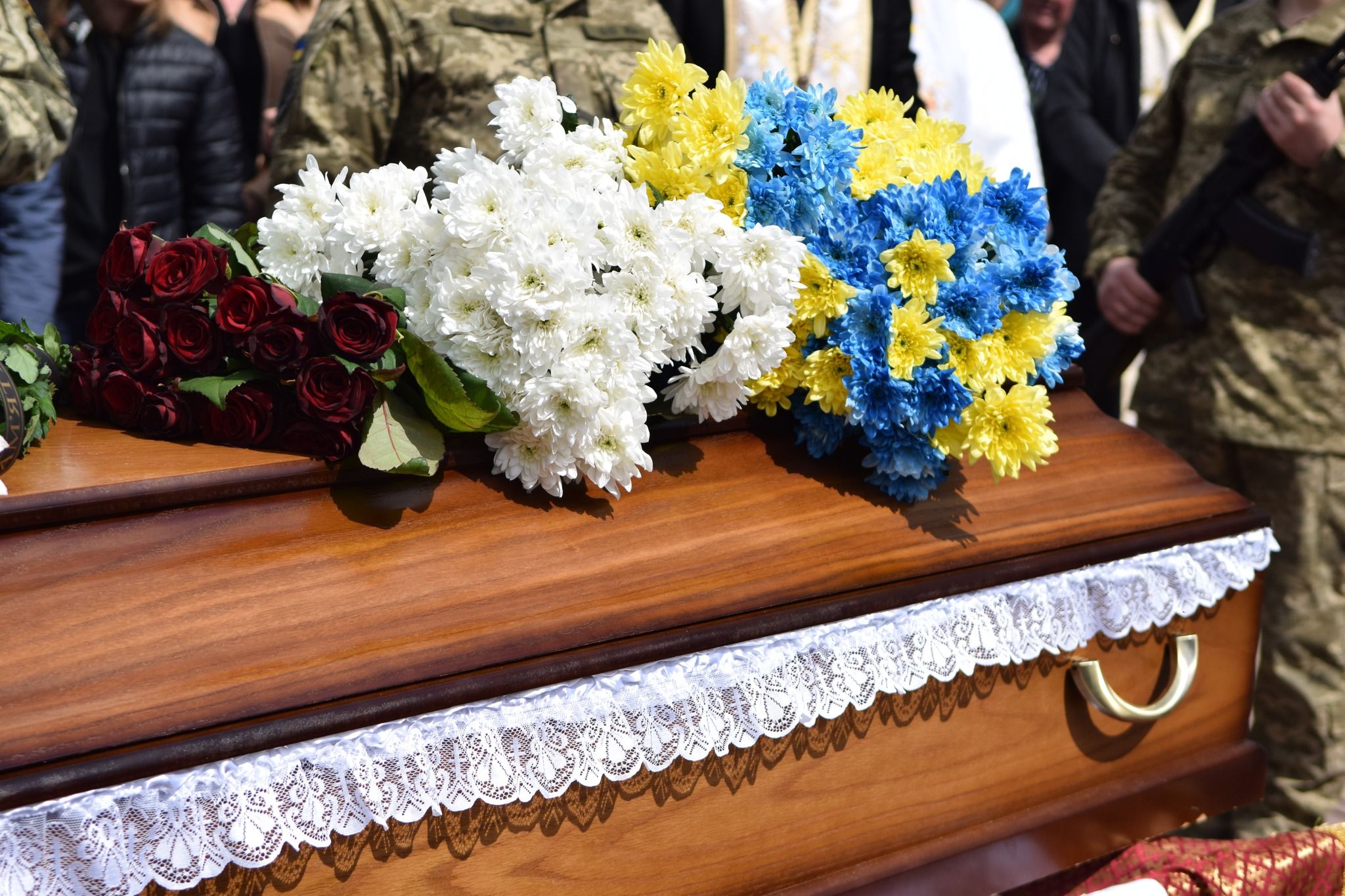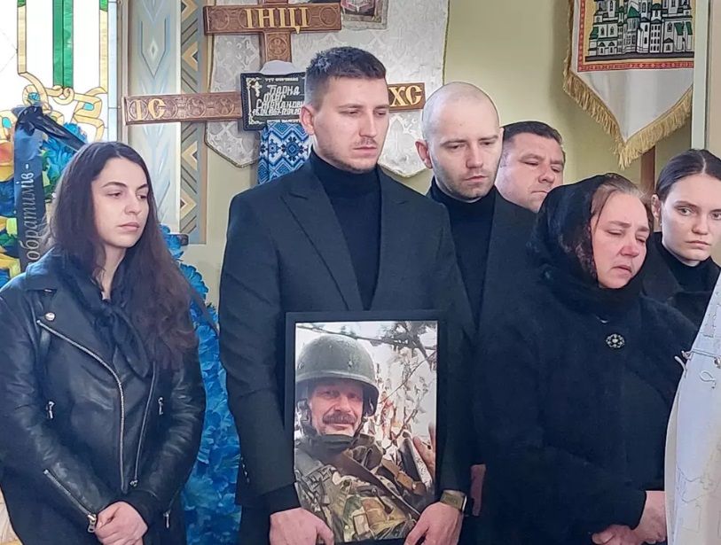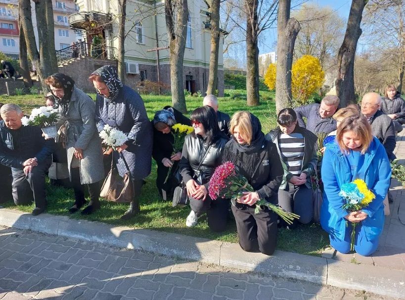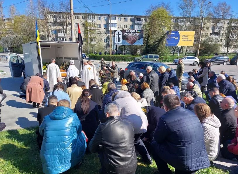 Люди, які прийшли попрощатись, стали на коліна перед загиблим бійцем, який віддав життя за українську незалежність.