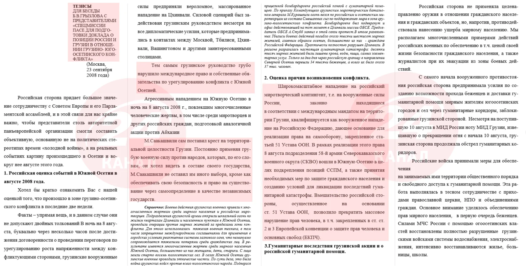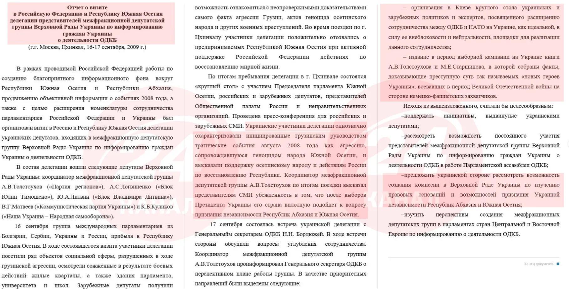 ... українські учасники делегації однозначно охарактеризували ініційовані грузинським урядом трагічні події серпня 2008 року як агресію, що супроводжувалася геноцидом народу Південної Осетії, та висловили підтримку осетинському народу та діям Росії щодо відновлення Республіки.