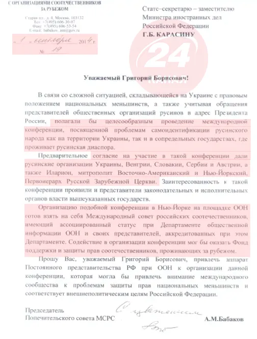 А щоб привернути увагу до проблеми, якої насправді не існувало, Бабаков через раду російських співвітчизників організовував проведення міжнародної конференції у Нью-Йорку на базі ООН. Допомагали йому в цьому діячі РПЦ, працівники МЗС, а також представники русинських організацій з Угорщини, Сербії, Австрії та Словаччини, які діяли за гроші рашистів.