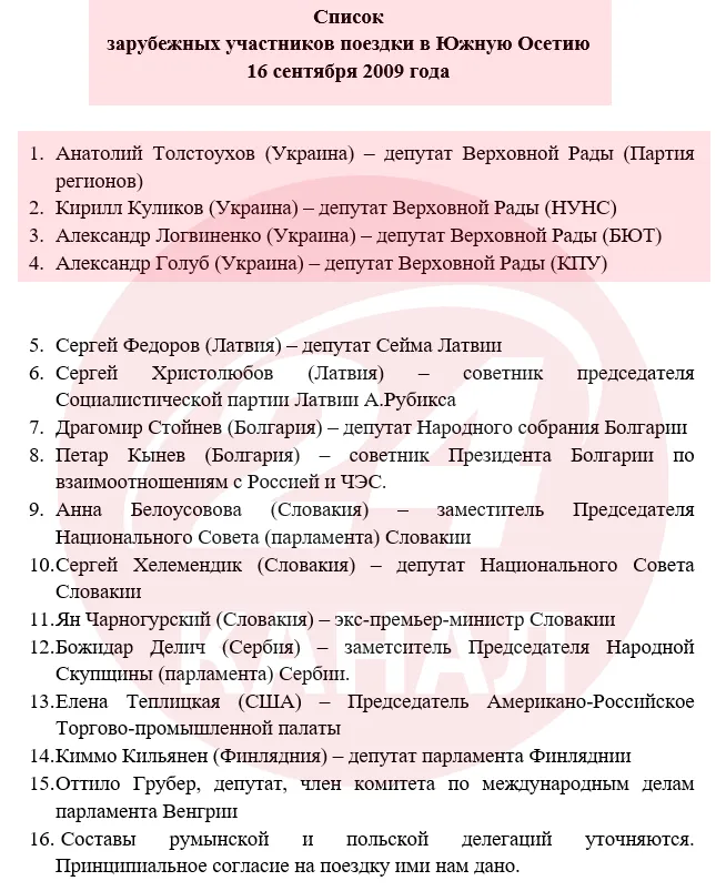 Аналогічну поїздку до Південної Осетії рашисти організовували й у 2009 році. Тоді Україну представляли Анатолій Толстоухов ("Партія регіонів", Кирило Куликов (НУ-НС), Олександр Логвиненко (БЮТ) та Олександр Голуб (КПУ).