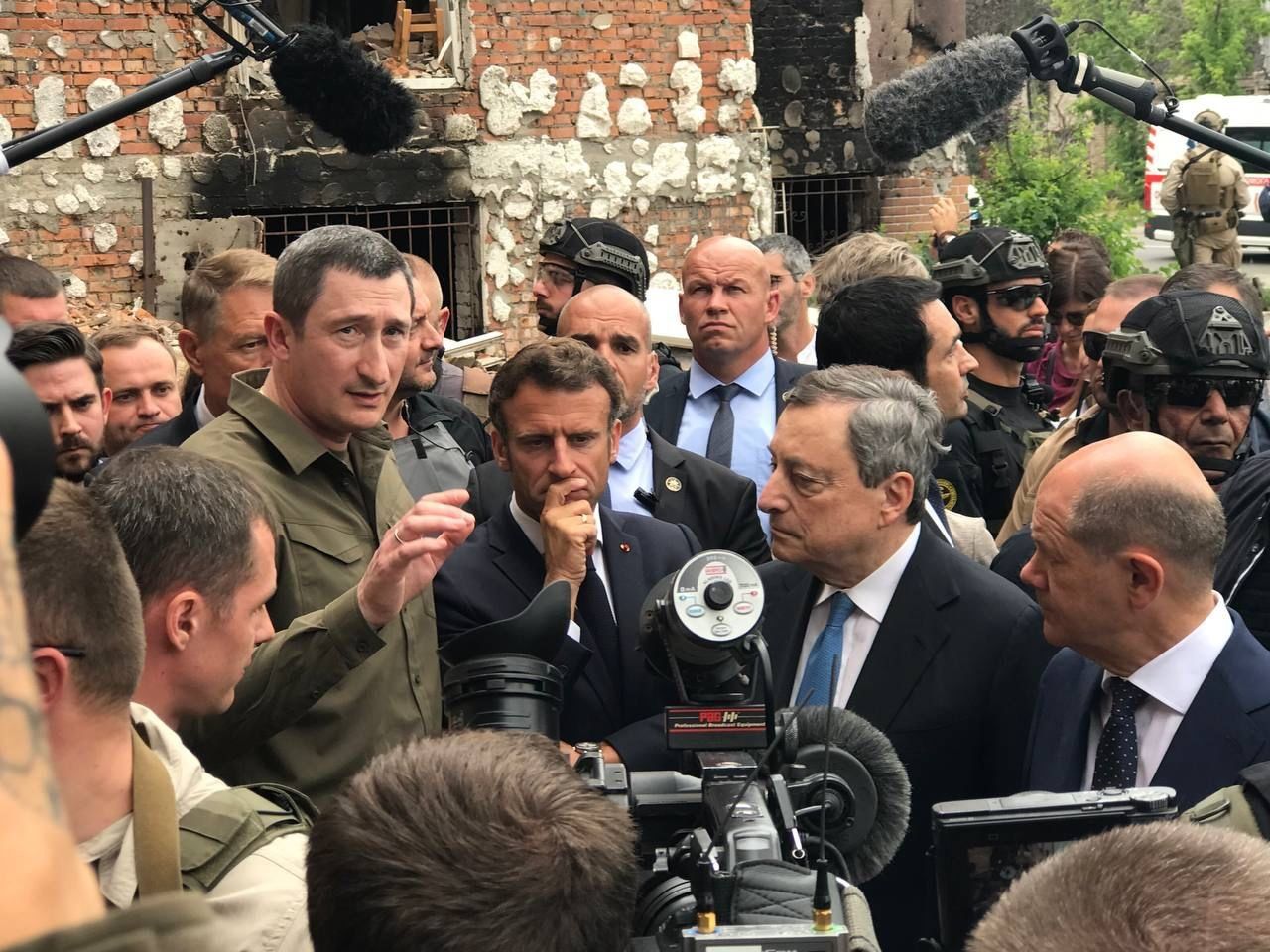 Чернишов та європейські лідери у зруйнованому росіянами Ірпені, липень 2022 року / Фото Мінрегіон