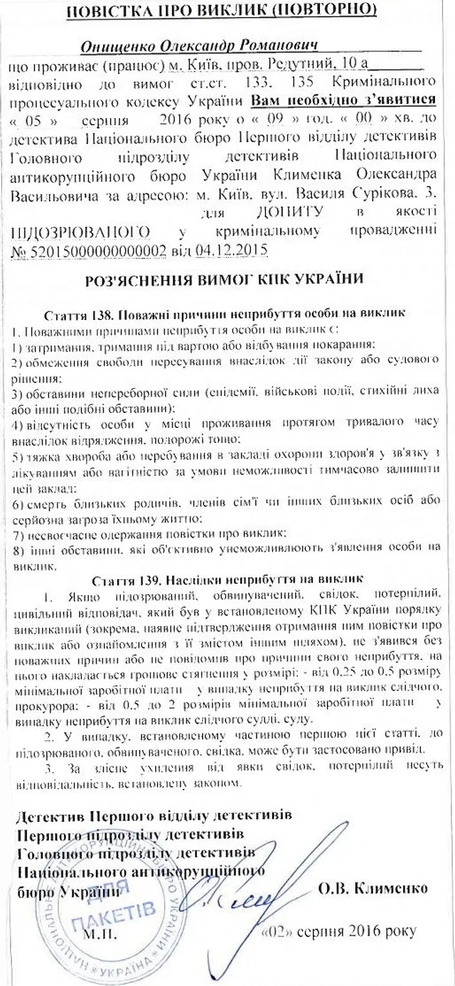 "Повістка про виклик Онищенка Олександра Романовича, що проживає: м.Київ, пров. Редутний, 10-А відповідно до вимог статей 133, 135 Кримінального кодексу України необхідно з'явитися 5 серпня 2016 року о 09:00 до детектива Першого відділу детективів Головного підрозділу детективів Національного антикорупційного бюро України Клименка Олександра Васильовича", – йдеться у повідомленні.