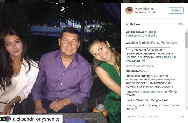 Праворуч від Онищенка сидить Вікторія Боня – російська телеведуча, модель и колишня учасниця реаліті-шоу "Дім-2". Зліва від українського нардепа – Софія Никитчук – переможниця конкурсу краси "Міс Росія-2015".