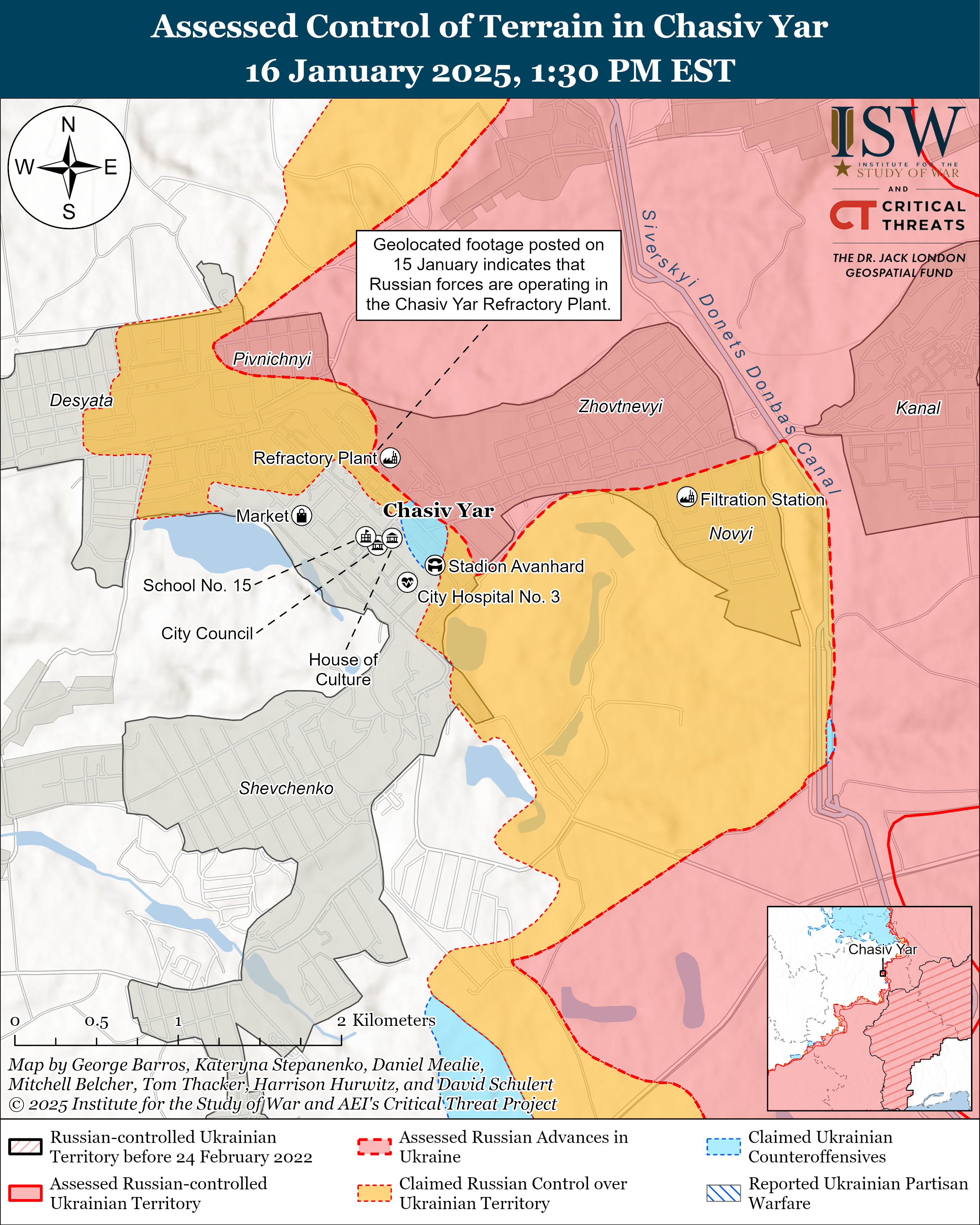 - Російські війська 15 і 16 січня продовжували наступальні операції на північний схід від Харкова в районі Вовчанська і Тихого, але не зробили жодного підтвердженого просування. Так само на Куп'янському та Лиманському напрямках і до Борової.