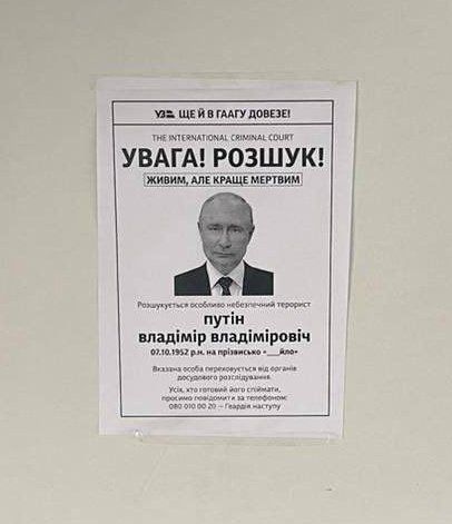 На чорно-білому постері великими літерами написано "Увага! Розшук!", а нижче відзначено, що злочинця шукають живим, але краще мертвим. Далі – фото диктатора Путіна з підписок "розшукується особливо небезпечний терорист".
