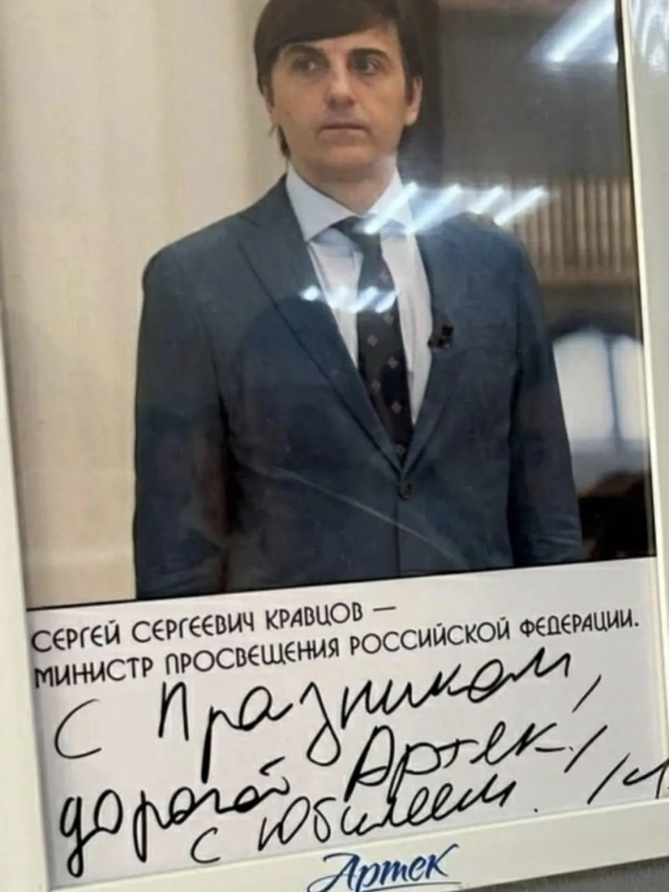 Під час візиту Кравцов вирішив залишити автограф на згадку, але припустився помилки, яка, ймовірно, назавжди увійде до історії освіти у Росії. Автограф у рамці зі склом повісили на стіну разом із фотографією міністра освіти.