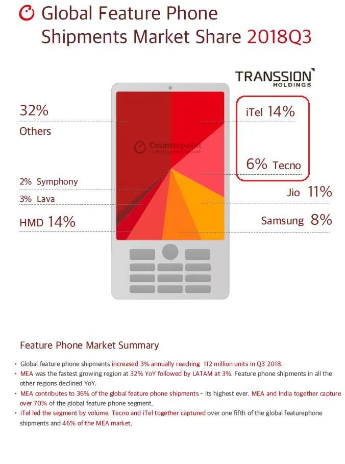 Таким чином, поки більшість світових виробників втрачають клієнтів і прибуток, TRANSSION Holdings нарощує потужності, і не тільки в Африці. У 2017 році холдинг продав майже 130 мільйонів мобільних телефонів, і посів 4-е місце в світі.