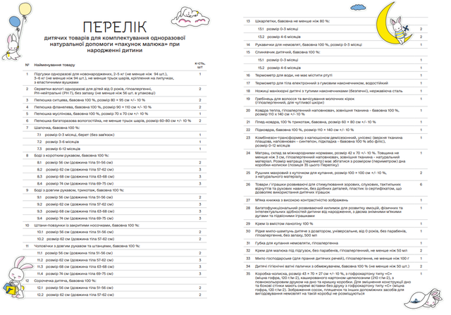 - Наповнення пакунку малюка оцінюють у 3 прожиткові мінімуми для дитини до 6 років. Із 1 липня 2021 року – це 6 039 гривень на місяць, а з 1 грудня 2021 року – 6 300 гривень.