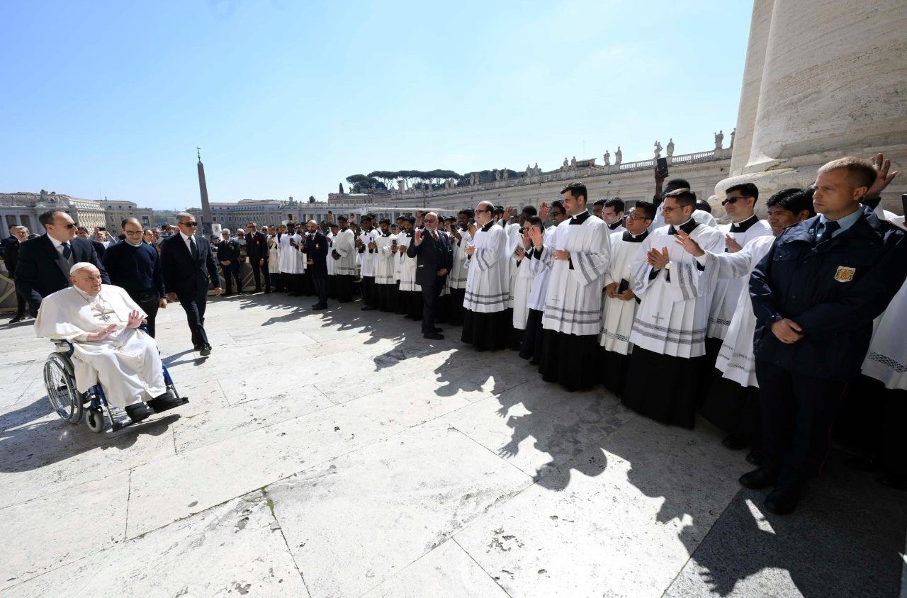 Це перша публічна поява понтифіка у Ватикані після того, як 2 тижні тому, 23 березня, він покинув лікарню Джемеллі. Тоді Папа звернувся до вірян із балкона своєї палати.