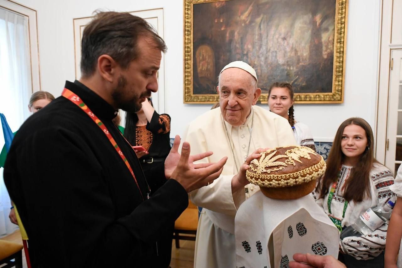 Зустрітися з Папою до Лісабону прибуло аж 500 юних українців. Вони розповіли главі Католицької церкви про пережиті страждання за пів року війни, а також вручили йому гостинці: сніп пшениці, коровай та зарваницьку воду. Усі дарунки мали символічний підтекст. Українська молодь хотіла через них донести, що в Україні люди гинуть не лише через ворожі ракетні обстріли, але й через безпосередні їхні наслідки: від голоду і нестачі води.