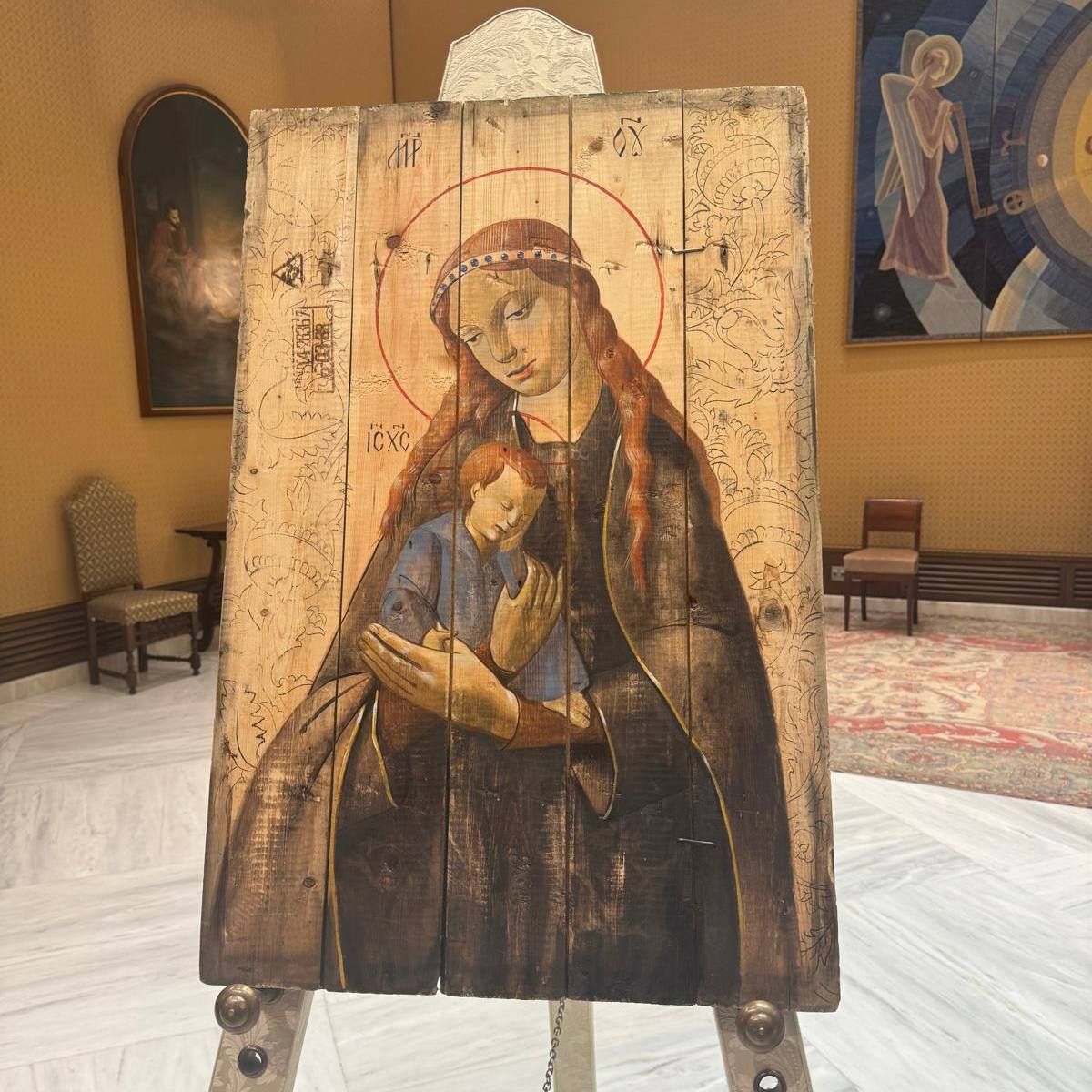 Український лідер та понтифік обмінялися подарунками. Відомо, що політик презентував Папі особливу ікону – "Божу Матір з немовлям", написану на фрагменті ящика з-під важких артилерійських озброєнь, привезеного з-під Ізюма.