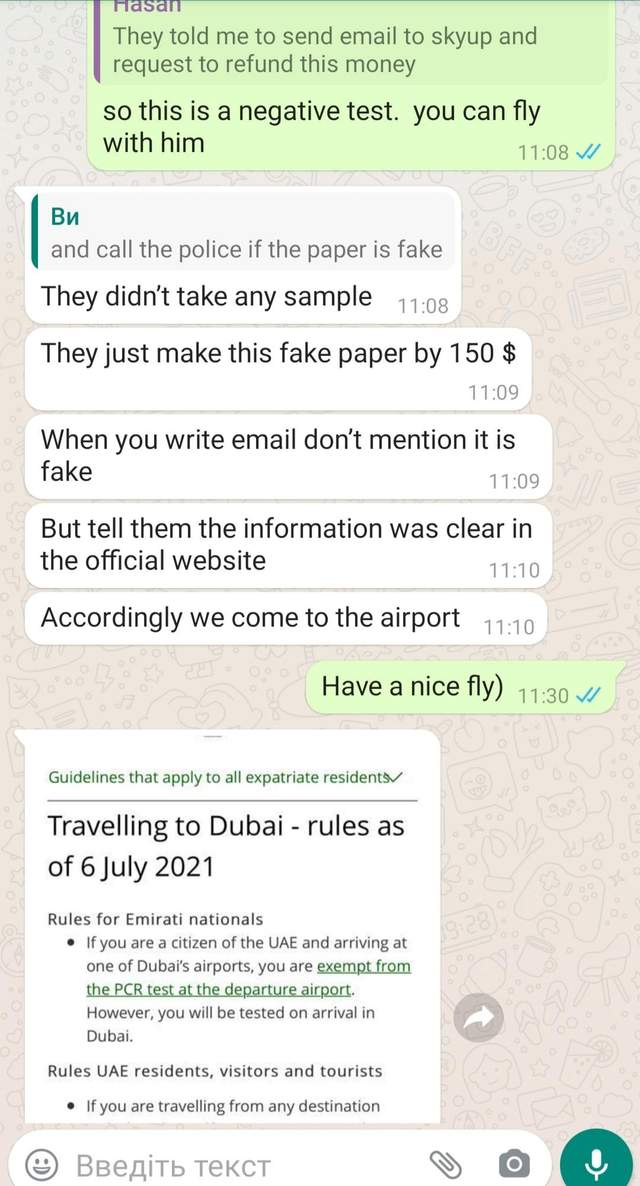 Але! Представник аеропорту запропонував купити негативний результат тесту у офіційній лабораторії за 150 доларів. Оплата, звісно, кешем. Друг купив цей тест,