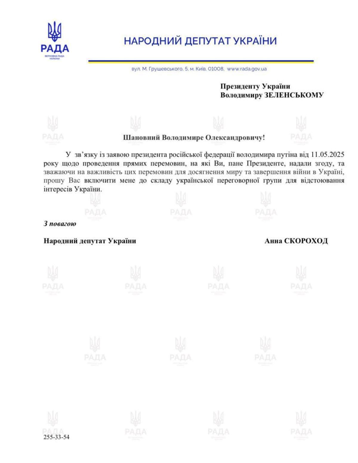 - Нардепка Анна Скороход звернулася до президента України з проханням долучити її до переговорної групи з Росією.
