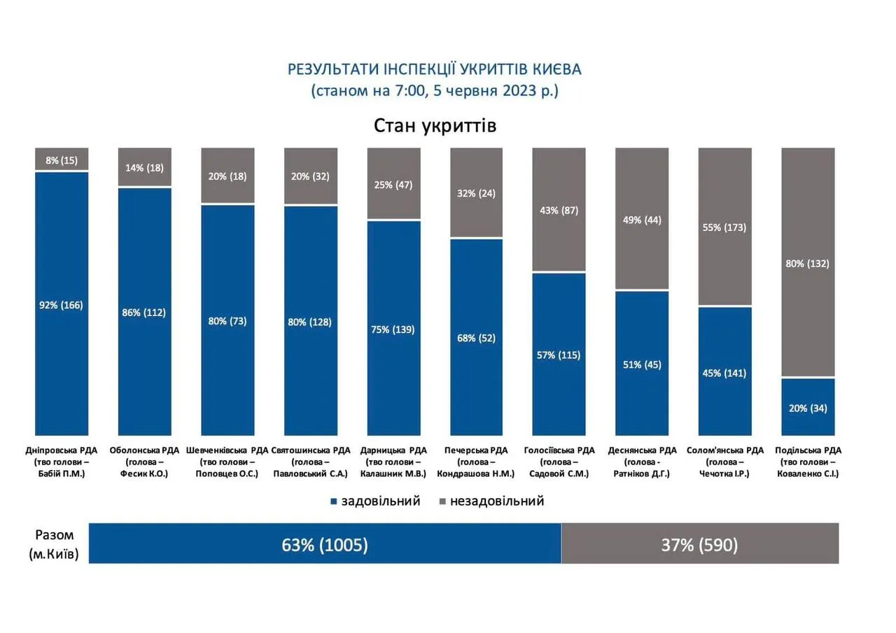 За результатами перевірки виявилося, що у двох районних держадміністраціях, Солом'янській і Подільській, ситуація найгірша. Зокрема, у Подільській РДА у незадовільному стані перебувають 132 укриття з 166.