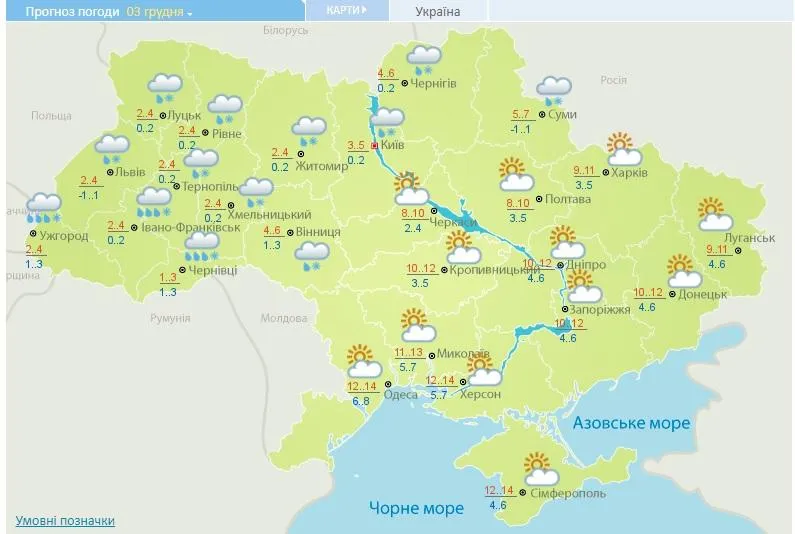 Прогноз погоди на 3 грудня / Скриншот зі сайту Укргідрометцентру