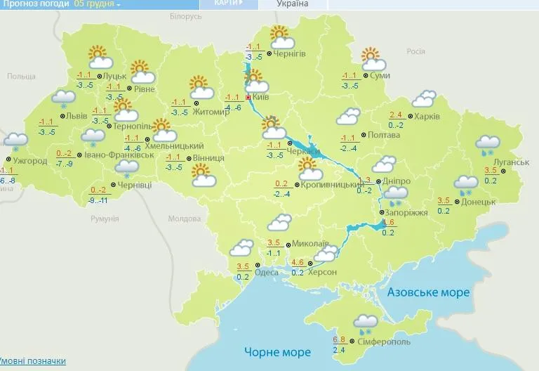 Прогноз погоди на 5 грудня / Скриншот зі сайту Укргідрометцентру