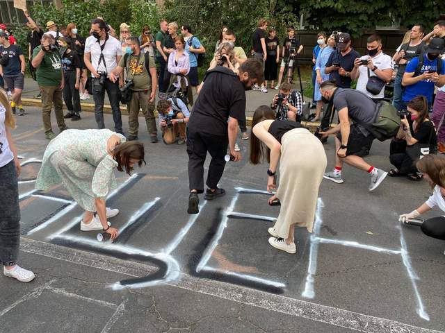 На демонстрацію прийшло близько сотні людей. Вони малювали на асфальті прізвища Аваков, Геращенко тощо.
