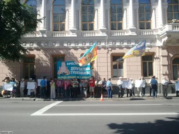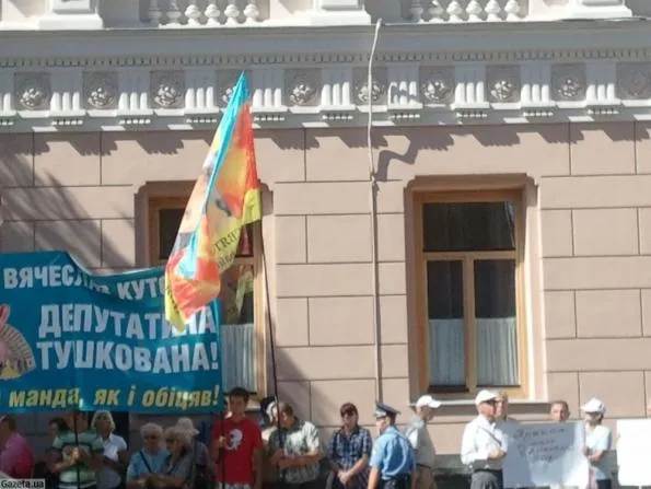 У їхніх руках відповідні плакати, зокрема – 2-метровий плакат із написом "В'ячеслав Кутовий – депутатина тушкована, склади мандат, як і обіцяв" та зображенням курячої тушки з головою депутата на фоні доларових купюр, – пише Gazeta.ua.