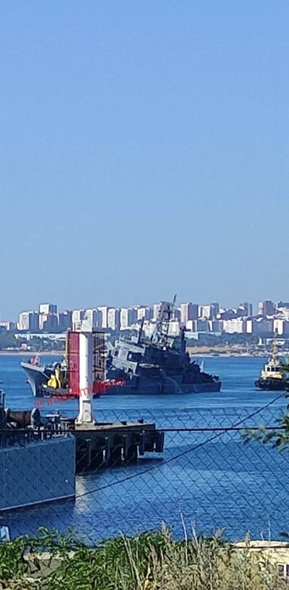 Своєю чергою, на фото, зробленому компанією Planet Labs PBC, також видно, що корабель відбуксувати назад на базу в російському порту Новоросійськ. Біля нього у воді можна побачити велику чорну пляму. Найімовірніше, це паливо.
